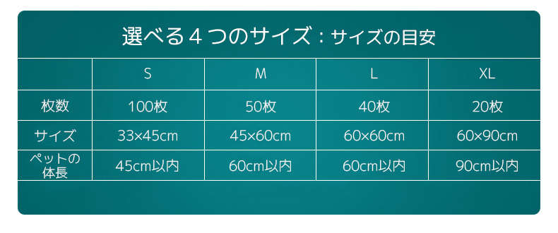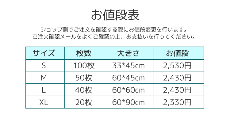 サイズ: S/33cm*45cm 100枚入り M/60cm*45cm 50枚入り L/60cm*60cm 40枚入り XL/60cm*90cm 20枚入り
