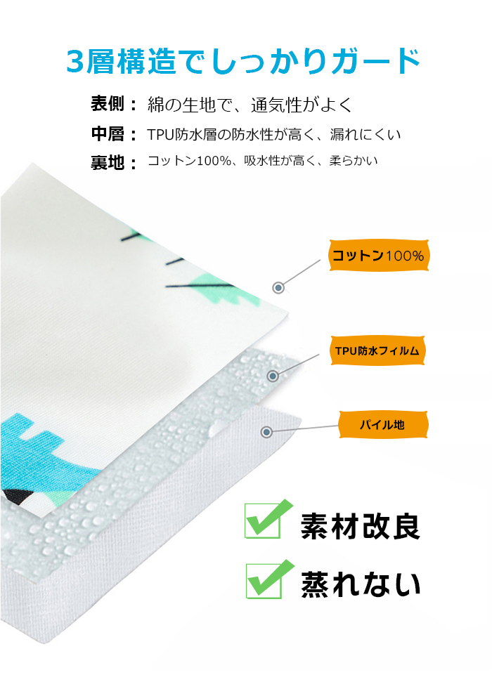 優しい肌さわりのコットン素材と防止素材