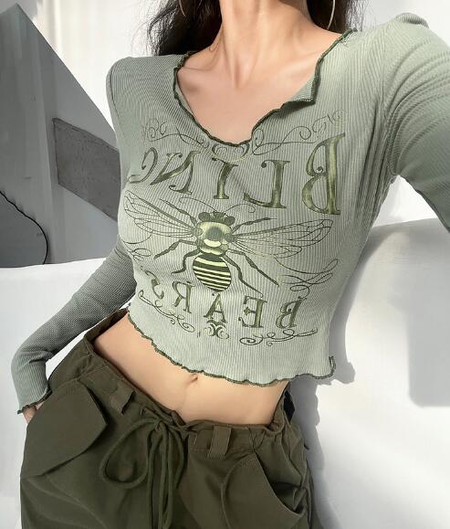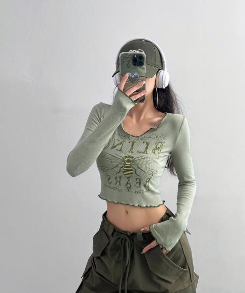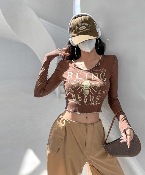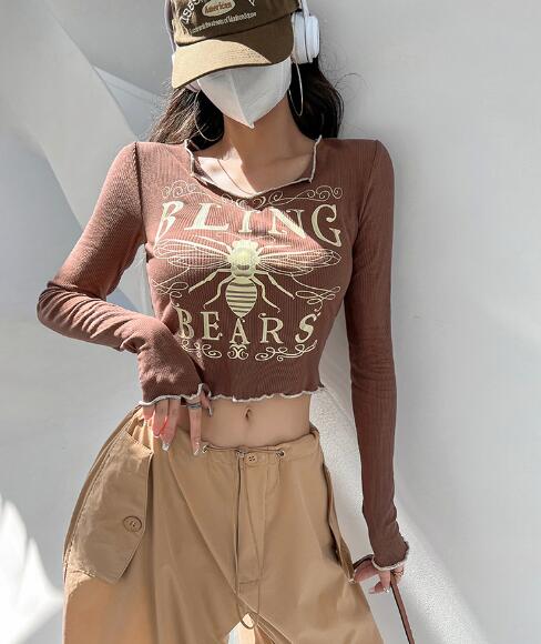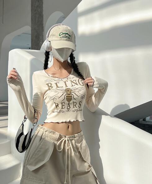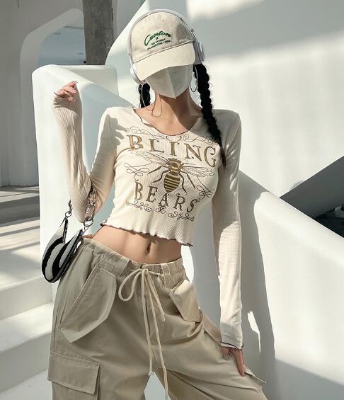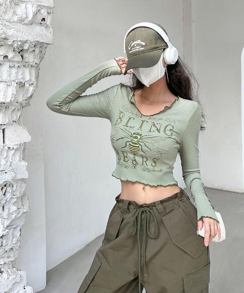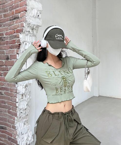 3色長袖トップスカットソーTシャツへそ