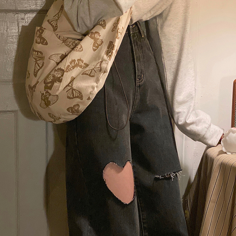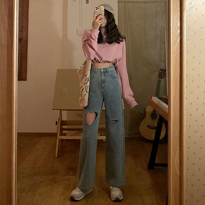 ハート デニム 2色 ジーンズ ジーパン パンツ ズボン ボトムス ダメージ ロング ストレート ハイウエスト ダンス 衣装 ヒップホップ HIPHOP レディース ガールズ ストレート 無地 シンプル 青 ブルー ブラック 黒 韓国 おしゃれ 可愛い 奇抜