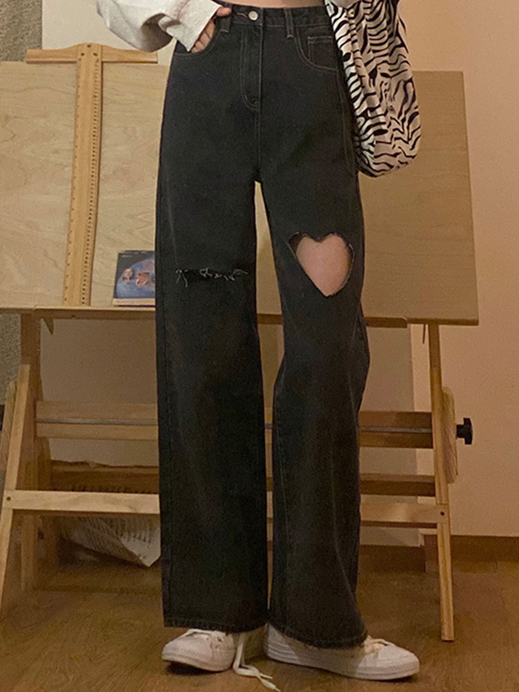 ハートデニム2色ジーンズジーパンパンツズボンボトムスダメージロングストレートハイウエストダンス衣装ヒップホップHIPHOPレディースガールズストレート無地シンプル青ブルーブラック黒韓国おしゃれ可愛い奇