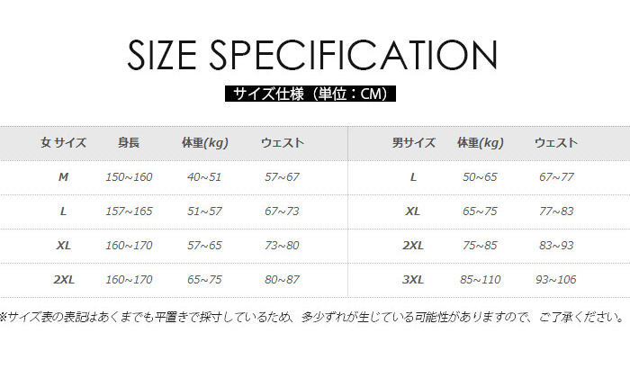 サイズ: 男L 男XL 男2XL 男3XL 女M 女L 女XL 女XXL