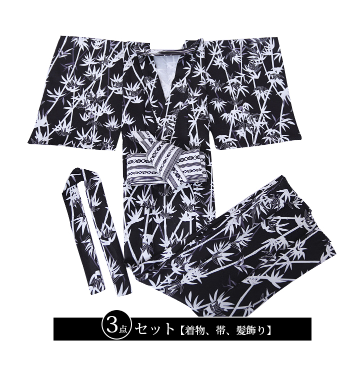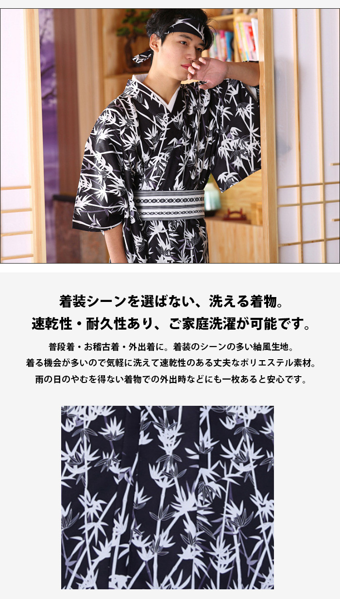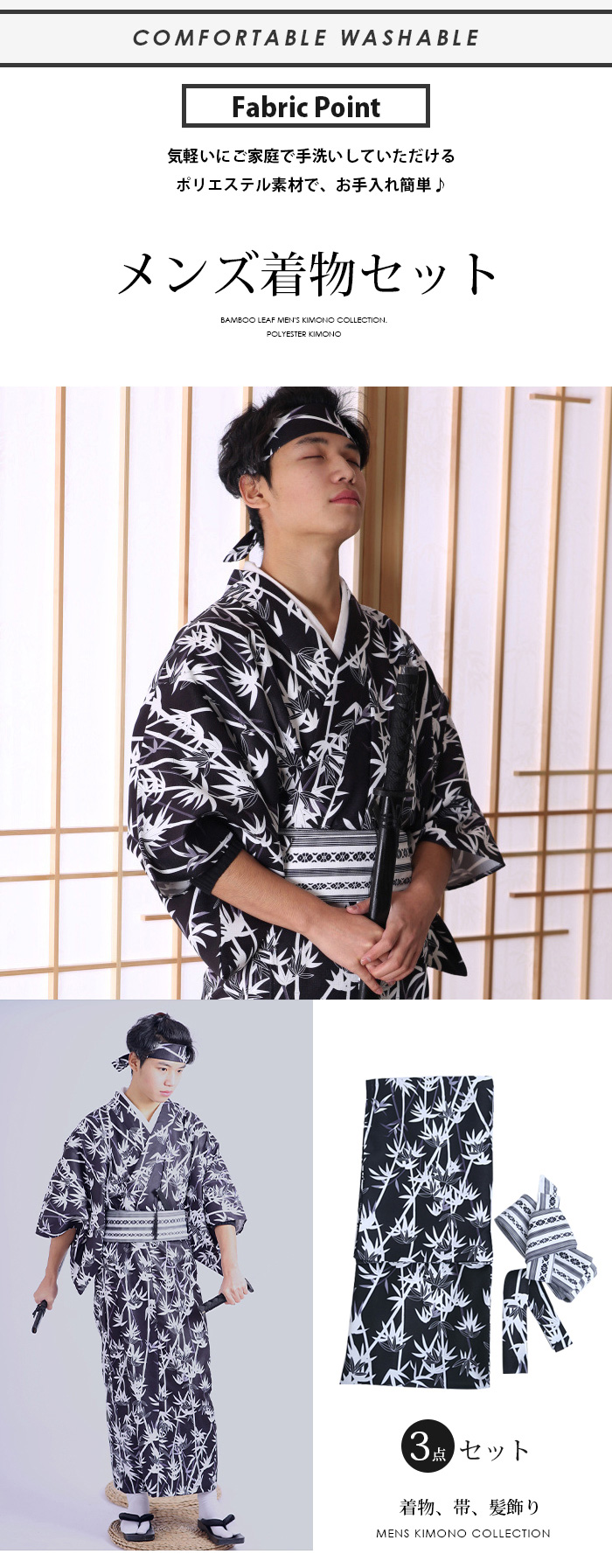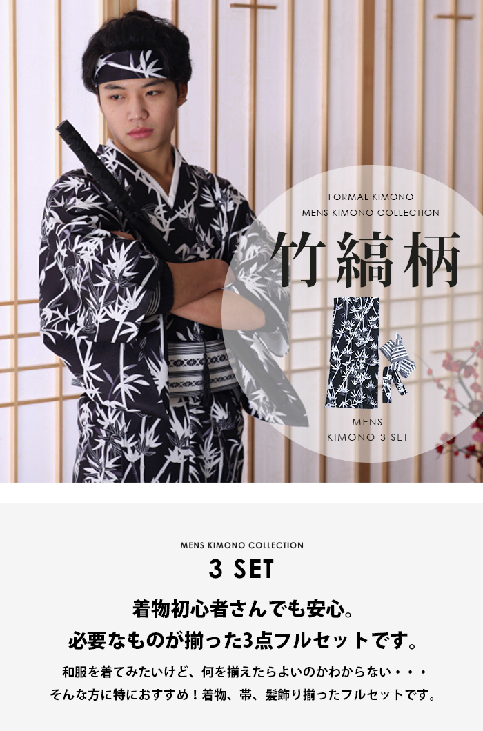 浴衣 メンズ 3点セット 花火大会 お祭りに大活躍 上品な質感 男性用 浴衣 竹 柄 部屋着 ポリエステル 伝統 竹 柄 前開きが脱着簡単 シンプル