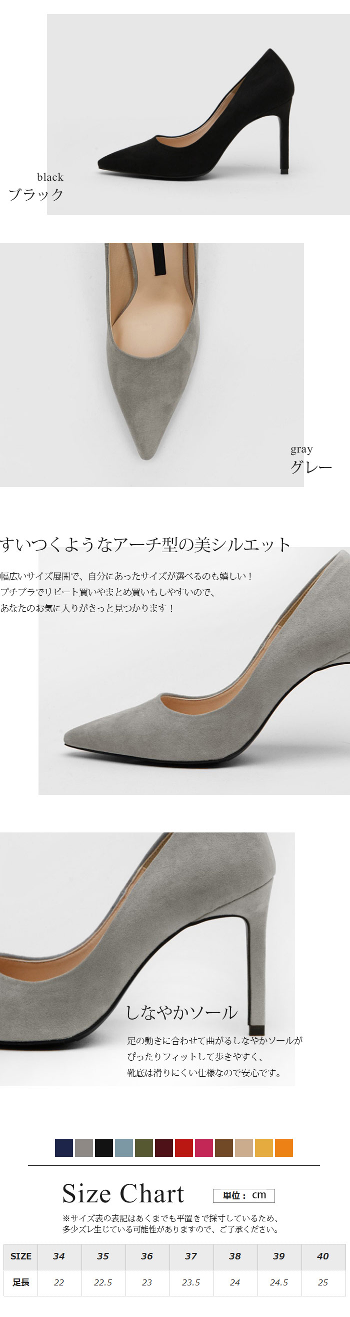 サイズ: 34(22.5cm) 35(22.5cm~23.0cm) 36(23.0cm~23.5cm) 37(23.5cm~24.0cm) 38(24.0cm~24.5cm) 39(24.5cm) 40(25.0cm)