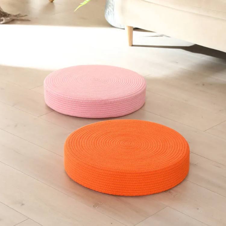 普段使用しないときは、重ねてコンパクトに片づけられ、来客時にサッと取り出せる丸座布団です。