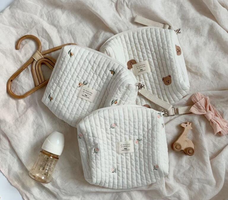 コットンマルチポーチ韓国雑貨北欧赤ちゃんベビーグッズ白ホワイトくまベアチューリップ花柄ロゴフックおむつポーチ刺繍キルティングミルク化粧おしゃれかわいいトラベルポーチママ 綿