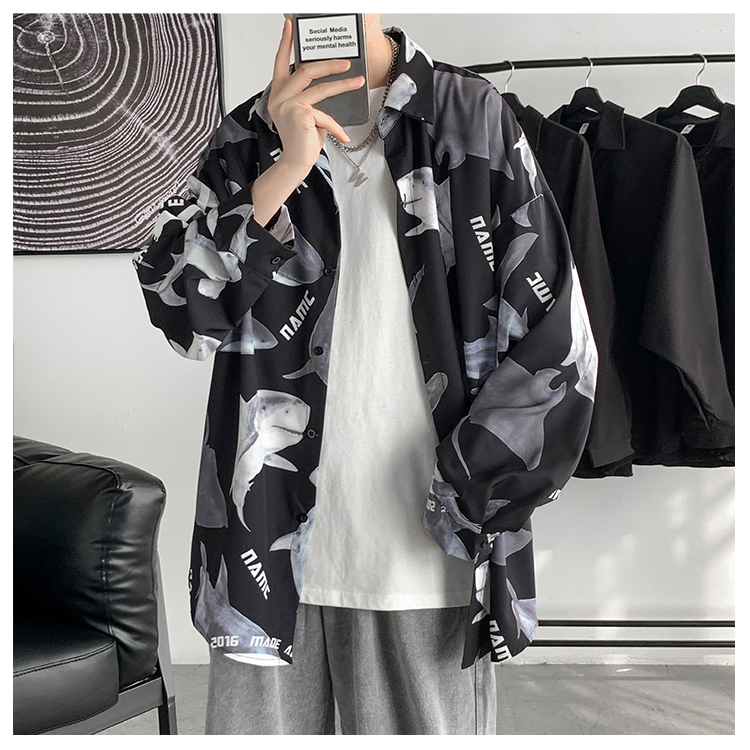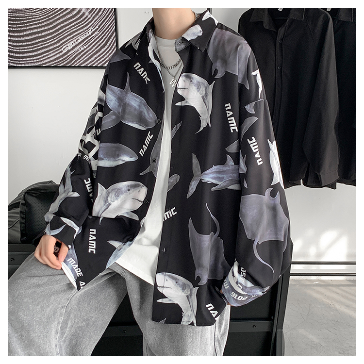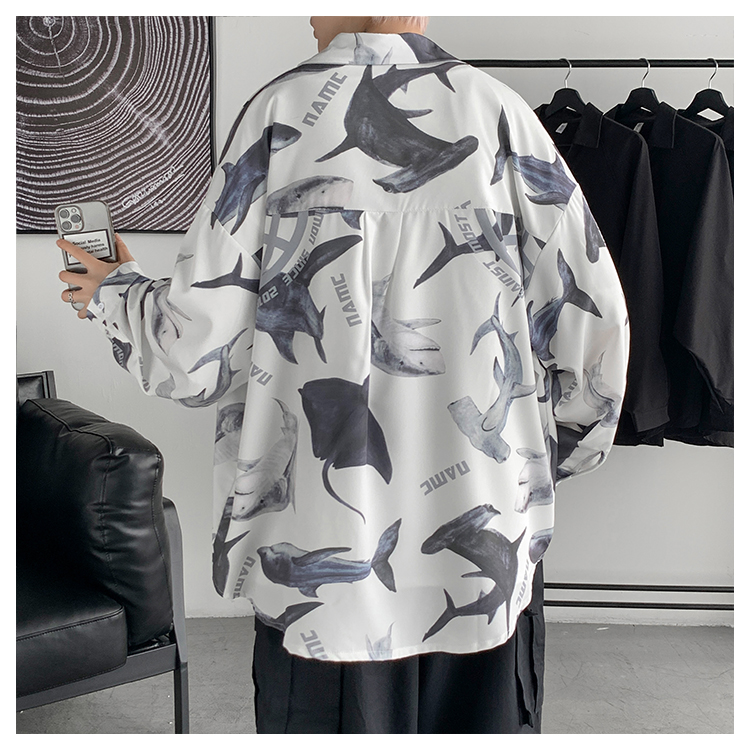 サメ シャツ 2色 ブラウス 長袖 トップス カットソー ジョーズ シャーク 黒 ブラック 白 ホワイト 大きいサイズ ビッグ レディース ガールズ メンズ ダンス 衣装 ヒップホップ HIPHOP 鮫 魚 韓国 奇抜 派手 総柄 柄シャツ 水族館 おしゃれ
