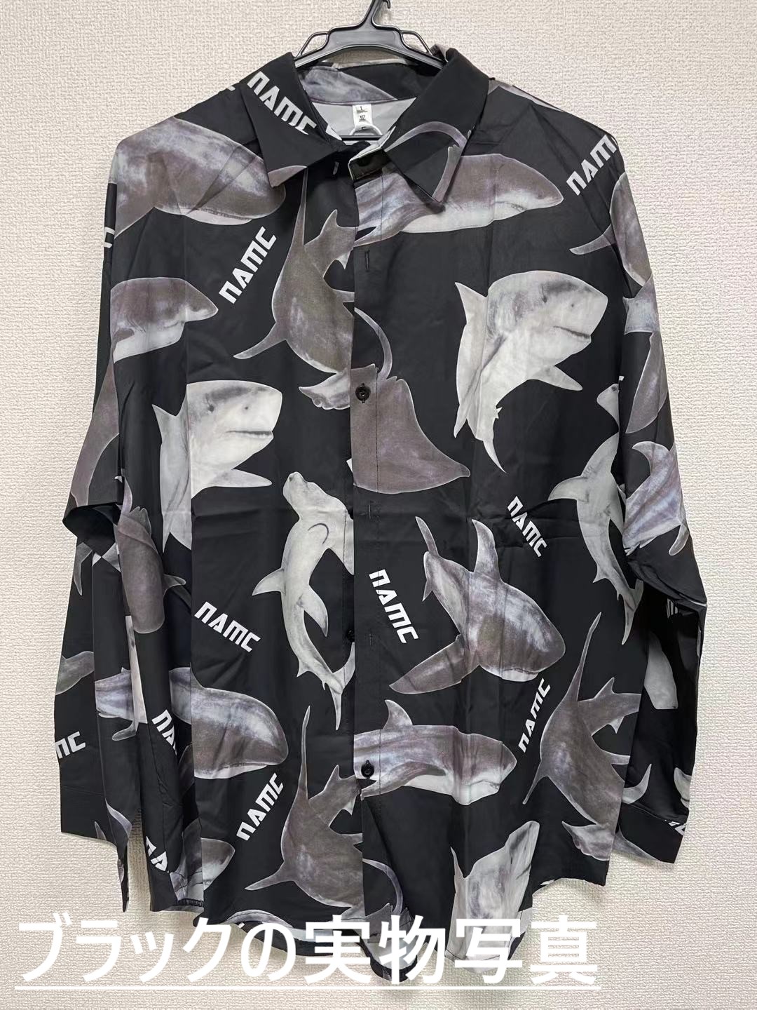 サメシャツ2色ブラウス長袖トップスカットソージョーズシャーク黒ブラック白ホワイト大きいサイズビッグレディースガールズメンズダンス衣装ヒップホップHIPHOP鮫魚韓国奇抜派手総柄柄シャツ水族館おしゃれ