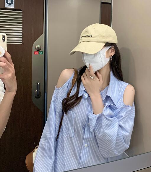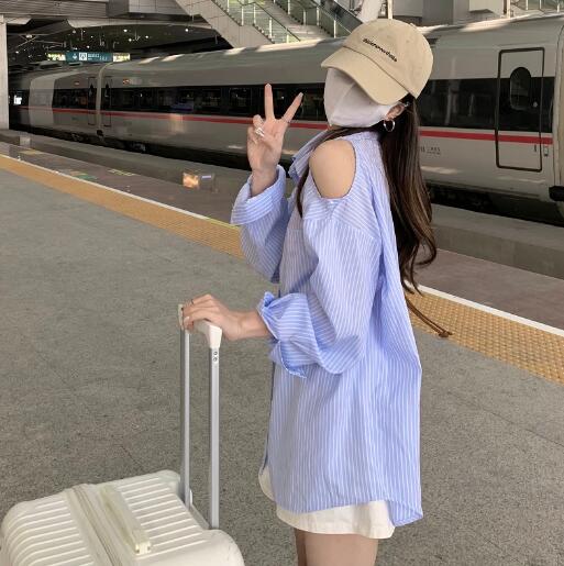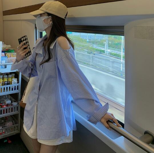 肩出し長袖トップスカットソーシャツブル