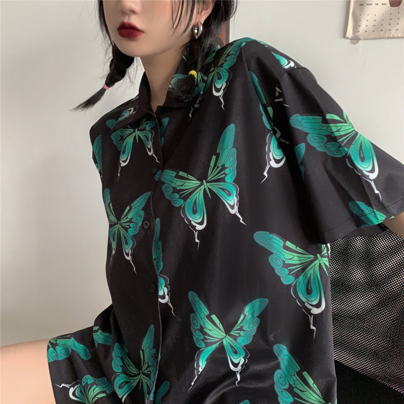 ちょうちょ ブラウス 半袖 シャツ 五分袖 トップス カットソー 前開き ボダン バタフライ 蝶 緑 グリーン 黒 ブラック レトロ ダンス 衣装 ヒップホップ HIPHOP レディース メンズ ガールズ ストリート 総柄 柄シャツ ヴィンテージ風 奇抜 派手