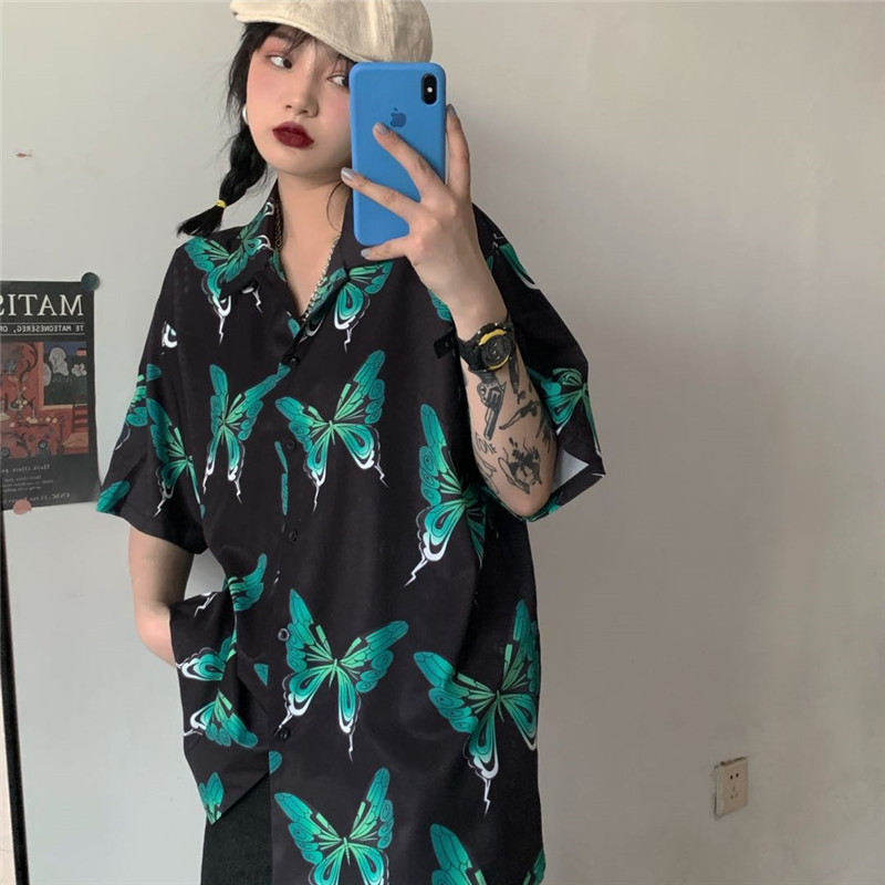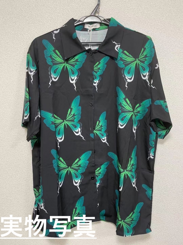 ちょうちょブラウス半袖シャツ五分袖トップスカットソー前開きボダンバタフライ蝶緑グリーン黒ブラックレトロダンス衣装ヒップホップHIPHOPレディースメンズガールズストリート総柄柄シャツヴィンテージ風奇抜