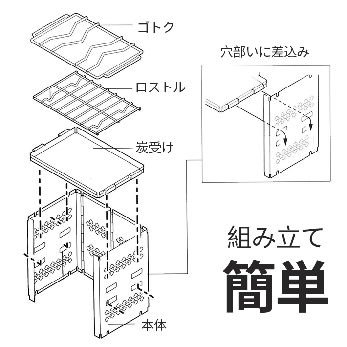 【セット内容】本体×1、炭受け×1、炭ストッパー×1、ゴトク×1、ロストル×1、収納袋×1