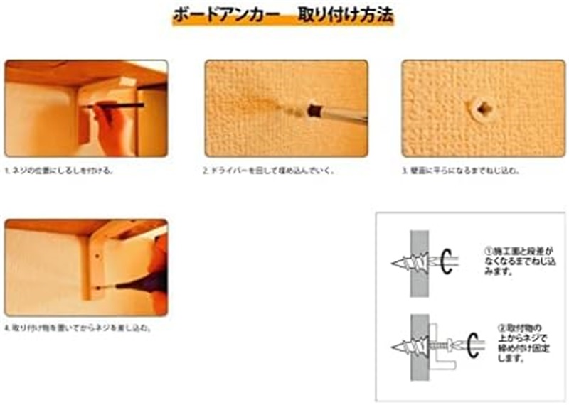付属のネジ、アンカーが付いておりますので、届いたらすぐに作業が出来ます。裏地の素材を気にせず取付可能。