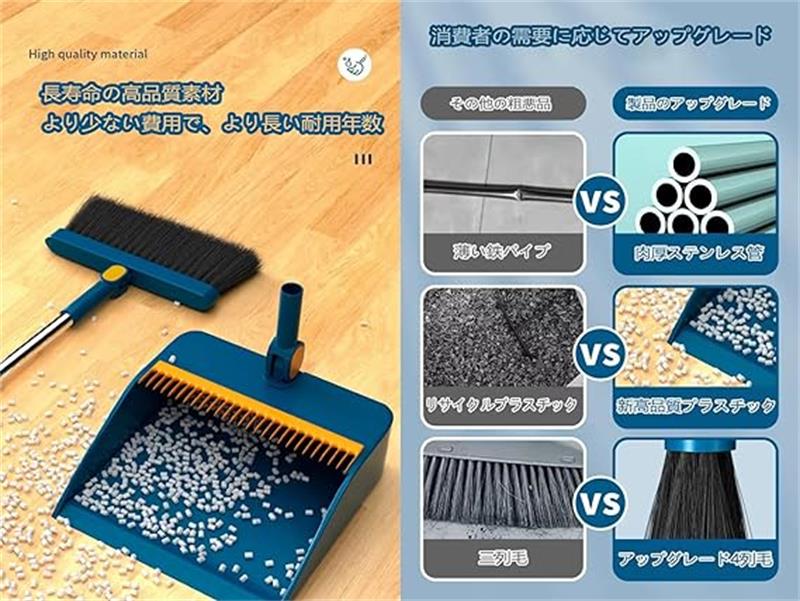 お客様に優れた掃除体験をもたらすために、私たちのほうきとちりとりは高品質の材料で作られています。あなたとあなたの家族の安全と健康を確保するために、純粋で無害な材料が選択されています。これらの高品質の材料は優れた耐久性と安定性を持っているだけでなく、掃除の過程で簡単にすべての種類の汚れやほこりに対処することができます。ほうきの毛もちりとりの構造も、効率的な掃除と簡単な空焚きができるよう、入念に設計されています。お掃除のたびに、比類のない品質保証と快適さ、心地よいお掃除体験をお楽しみいただけます。家を清潔に保つことは、快適で落ち着いた生活環境をもたらします。
