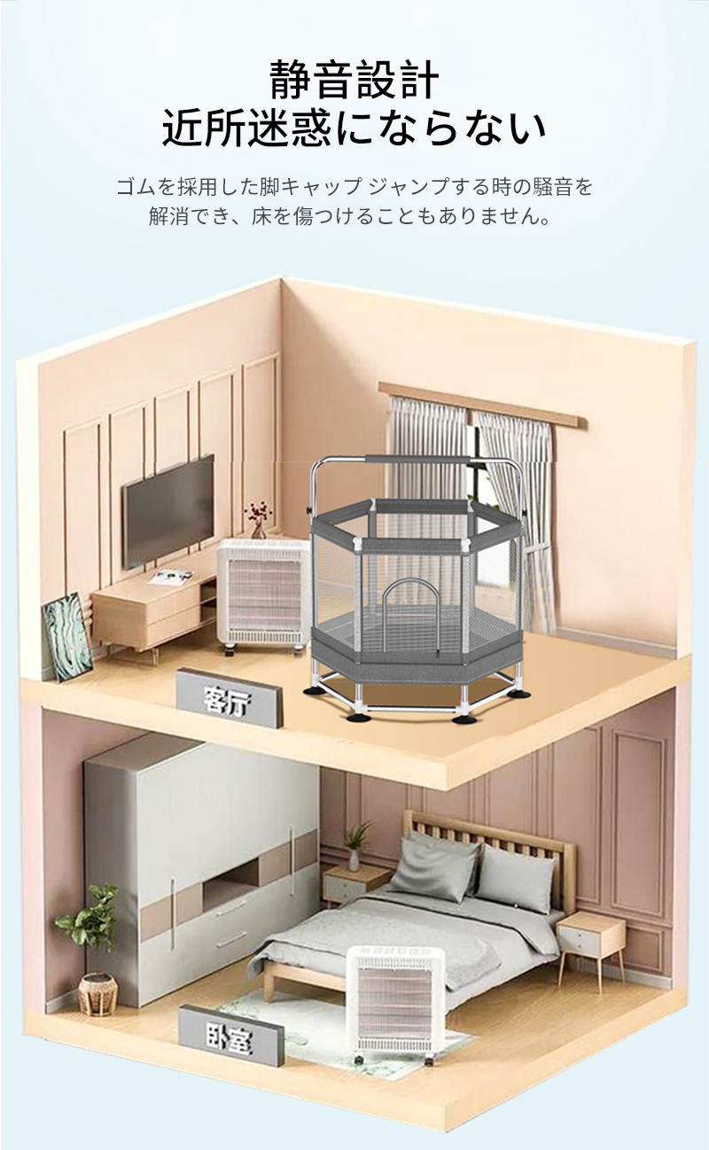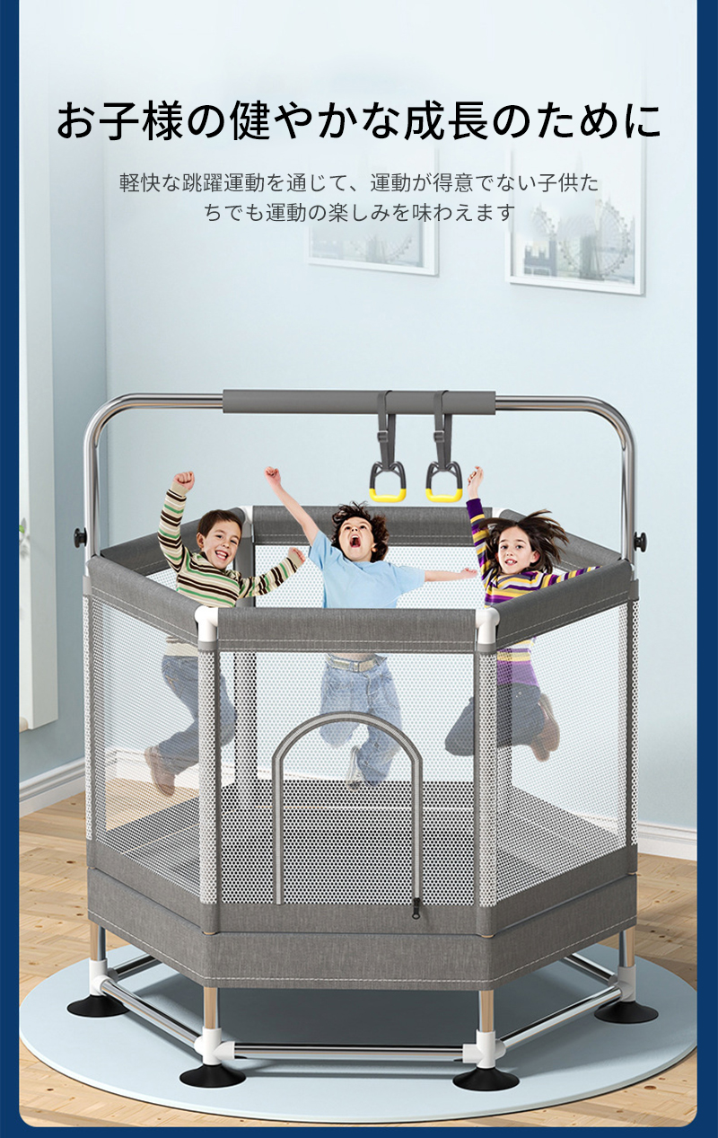 【六角形のデザイン】:トランポリンは六角形のデザインで、従来のモデルより安定感があります。 お子様がトランポリンで跳ねても、六角形の形状を利用してトランポリンが固定されるため、より頑丈で安定性が高く、転倒などの心配がありません。