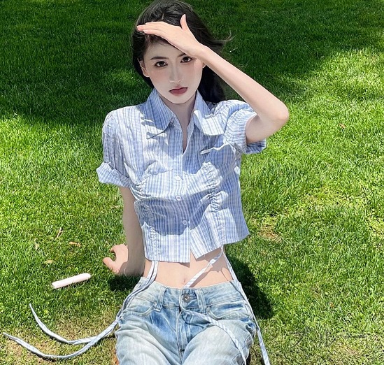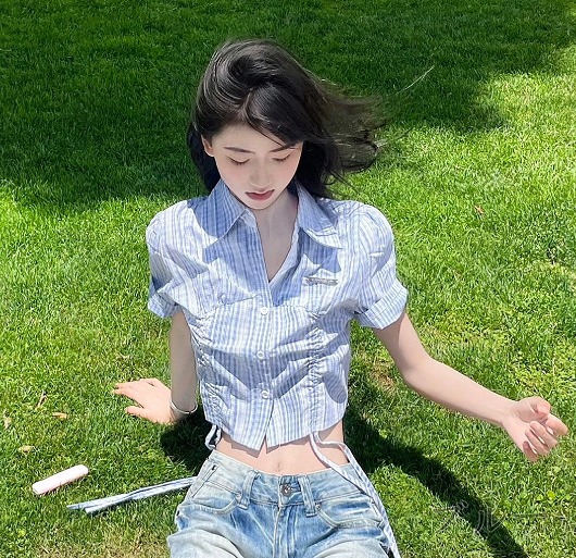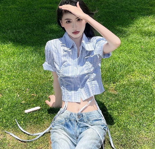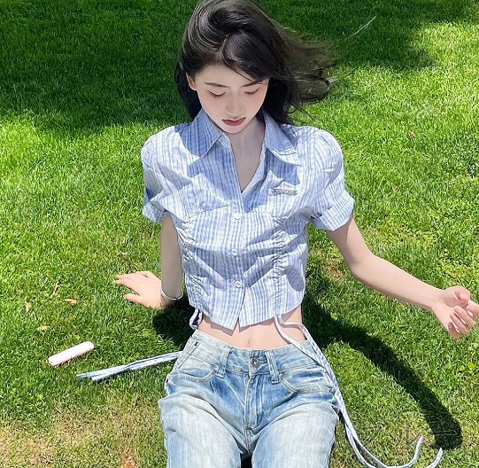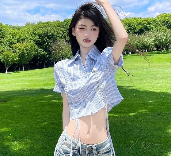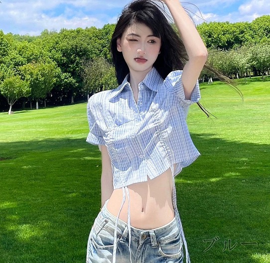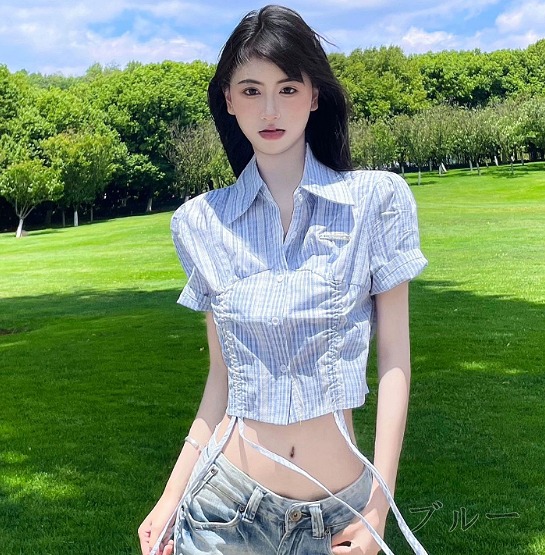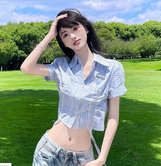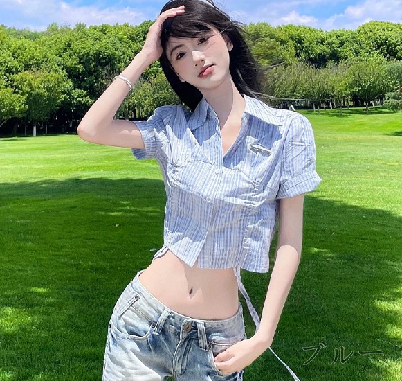 半袖トップスカットソーシャツ前開きへそ