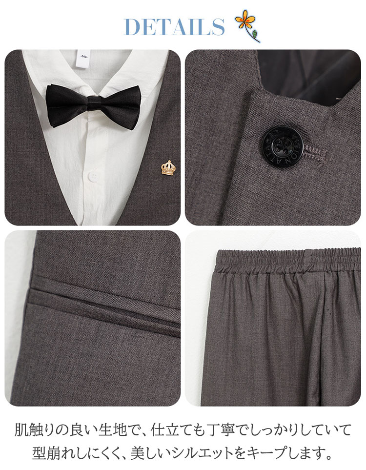 色んなフォーマルシーンで活躍できる、お誕生日パーティー、七五三、ピアノ発表会など お子様の晴れの舞台に是非、お使い下さいませ。素材 ベスト、ズボン:ポリエステル