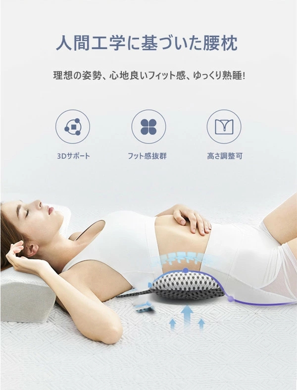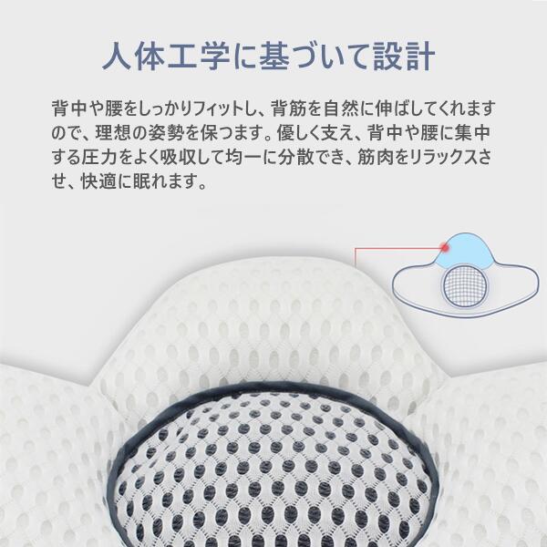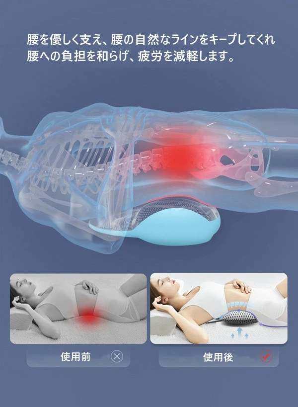 腰を優しく支え、腰の自然なラインをキープしてくれ腰への負担を和らげ、疲労を減軽します。 背中や腰をしっかりフィットし、背筋を自然に伸ばしてくれますので、理想の姿勢を保つます。優しく支え、背中や腰に集中する圧力をよく吸収して均一に分散でき、筋肉をリラックスさせ、快適に眠れます。