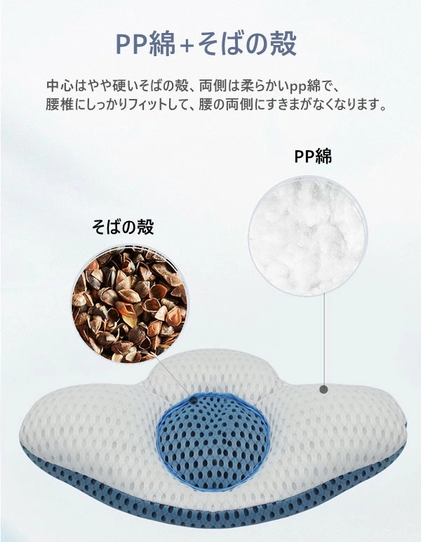 中心はやや硬いそばの殻、両側は柔らかいpp綿で、腰椎にしっかりフィットして、腰の両側にすきまがなくなります。
