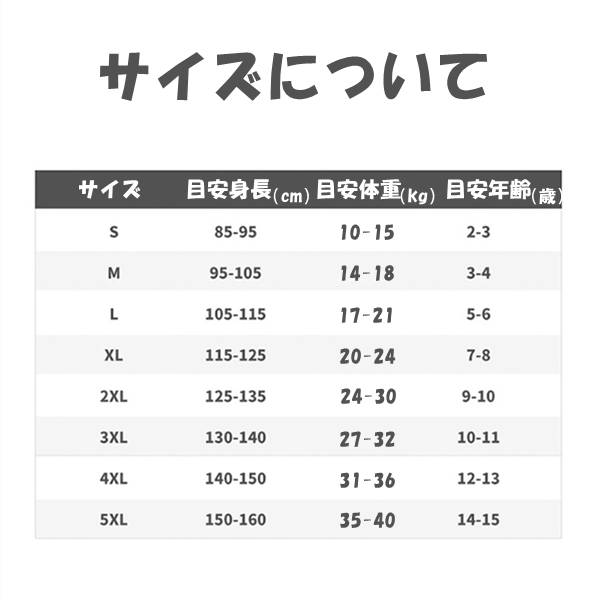 horizontal-key: S(目安身長85-95cm) M(目安身長95-105cm) L(目安身長105-115cm) XL(目安身長115-125cm) XXL(目安身長125-135cm) 3XL(目安身長130-140cm) 4XL(目安身長140-150cm) 5XL(目安身長150-160cm)