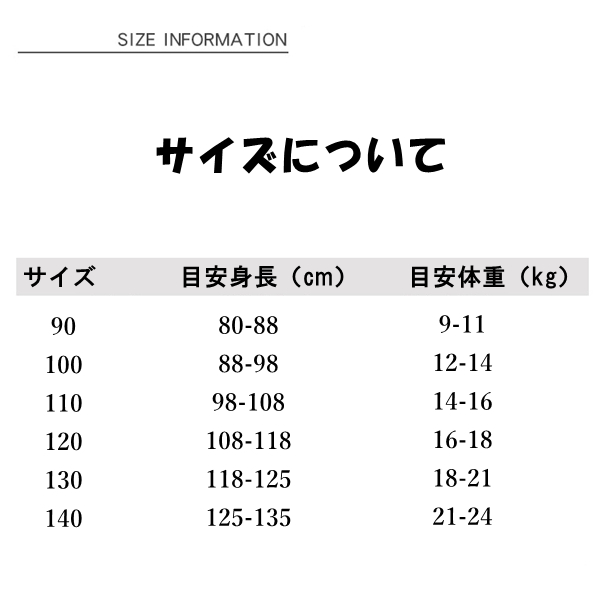 vertical-key: 90(目安身長80-88cm) 100(目安身長88-98cm) 110(目安身長98-108cm) 120(目安身長108-118cm) 130(目安身長118-125cm) 140(目安身長125-135cm)