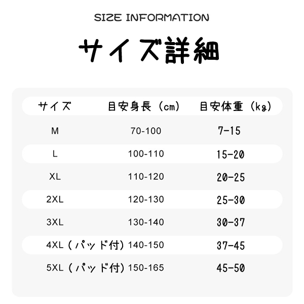 horizontal-key: L(目安身長100-110cm) XL(目安身長110-120cm) 2XL(目安身長120-130cm) 3XL(目安身長130-140cm) 4XL(目安身長140-150cm) 5XL(目安身長150-165cm)