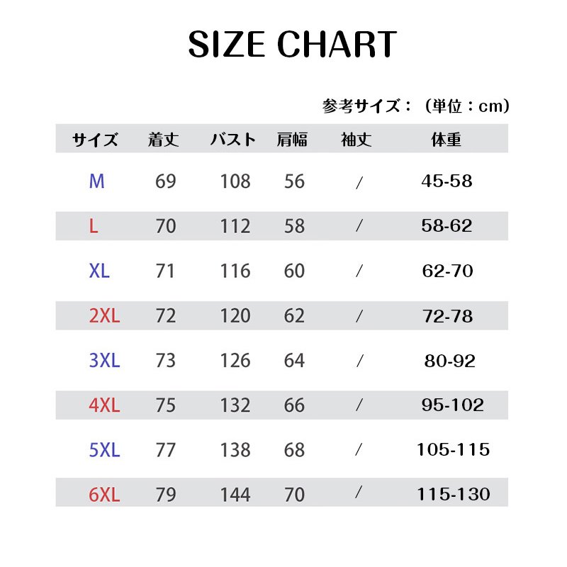 サイズ: M(S相当) L(M相当) XL(L相当) 2XL(L/LL相当) 3XL(LL/3L相当) 4XL(3L/4L相当) 5XL(4L/5L相当) 6XL(5L/6L相当)