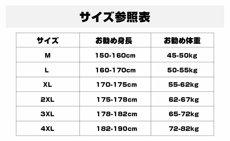 サイズ: M(S相当) L(M相当) XL(M/L相当) 2XL(L/LL相当) 3XL(LL/3L相当) 4XL(3L/4L相当)