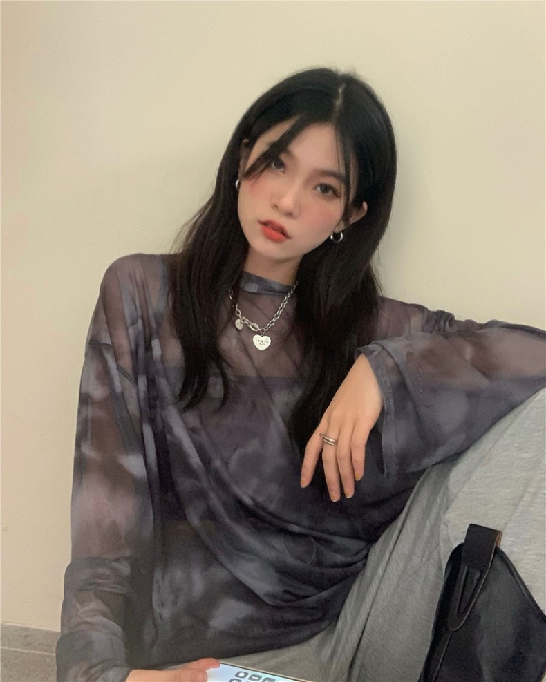 シースルータイダイ柄トップスカットソー長袖薄手透け感Tシャツグレーレディースメンズガールズダンス衣装ヒップホップHIPHOP韓国おしゃれかっこいい大きいビッグストリートマーブル個性的服