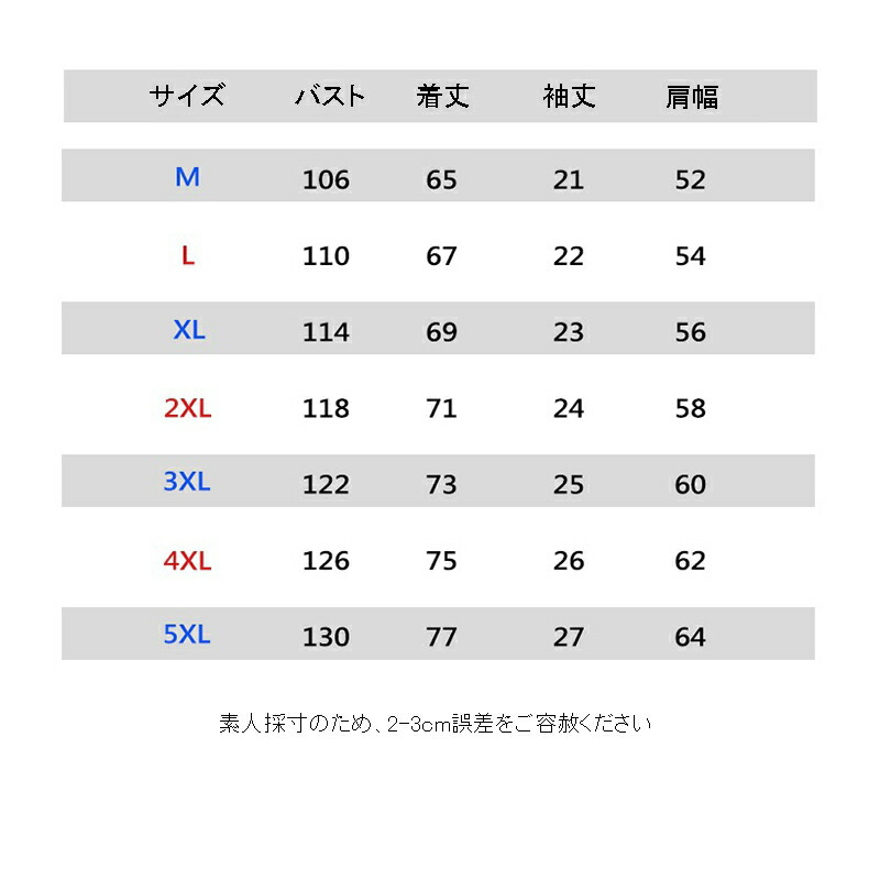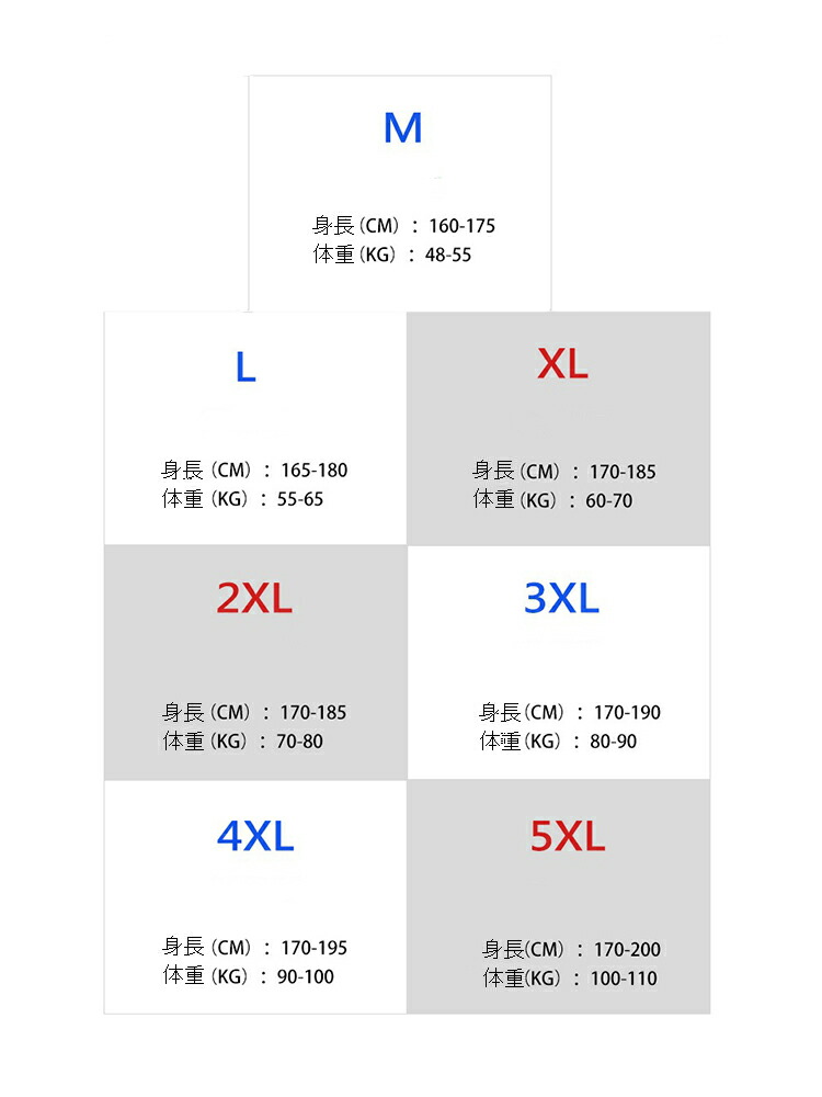 サイズ: M(S相当) L(M相当) XL(M/L相当) 2XL(L/LL相当) 3XL(LL/3L相当) 4XL(3L/4L相当) 5XL(4L/5L相当)