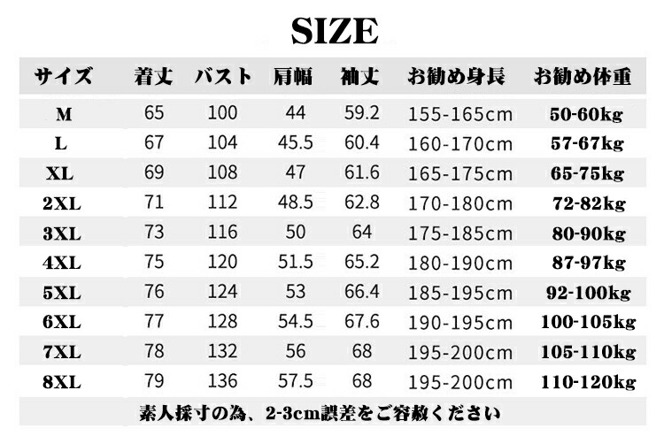 サイズ: M L XL 2XL 3XL 4XL 5XL 6XL 7XL 8XL