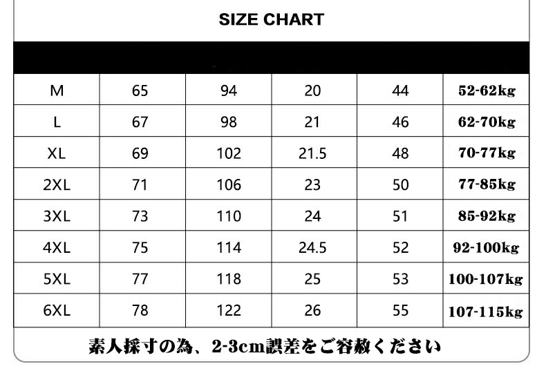 サイズ: M(S相当) L(M相当) XL(M/L相当) 2XL(L/LL相当) 3XL(LL/3L相当) 4XL(3L/4L相当) 5XL(4L/5L相当) 6XL(5L/6L相当)