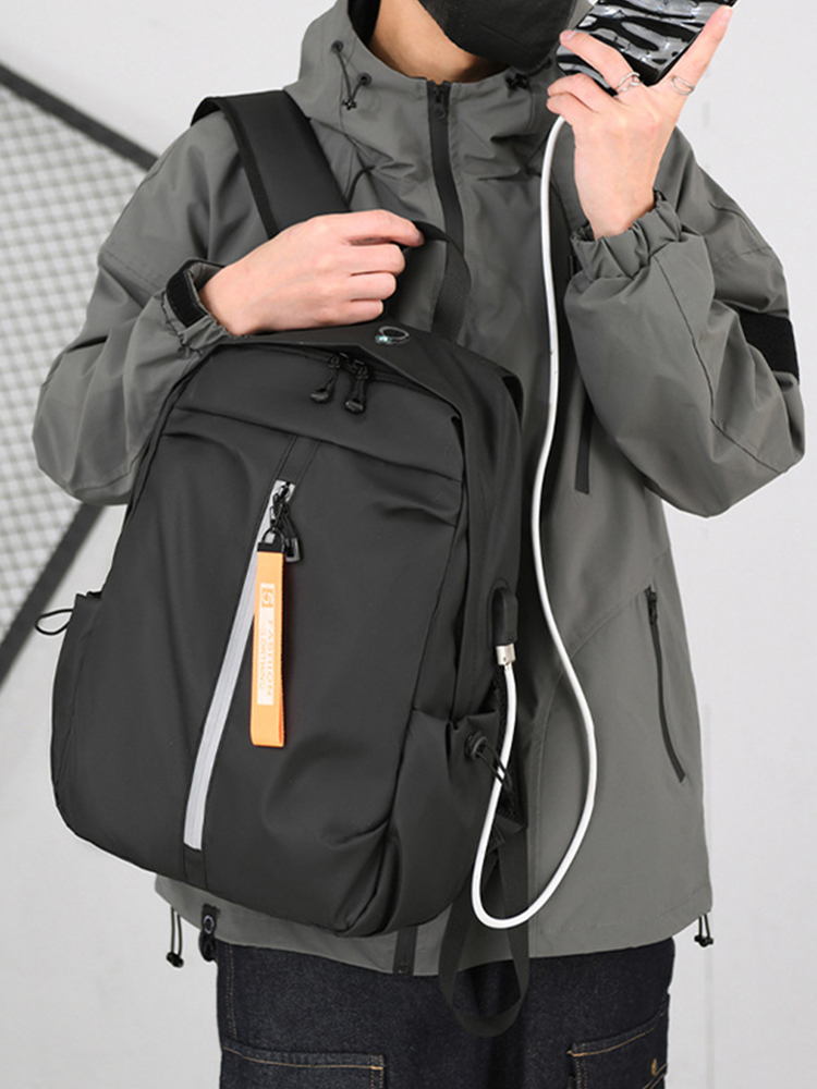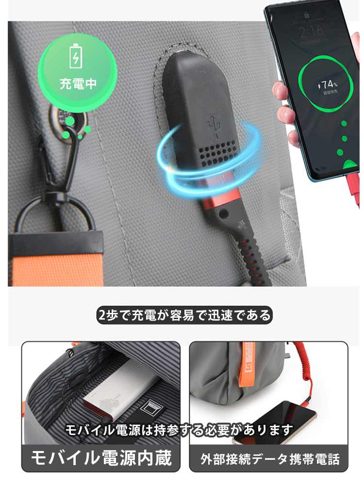 USBポート付きで、バッテリーをリュックの中に入れたまま、サッと充電ができます。 荷物が少ない時はコンパクトに使用することもできます。