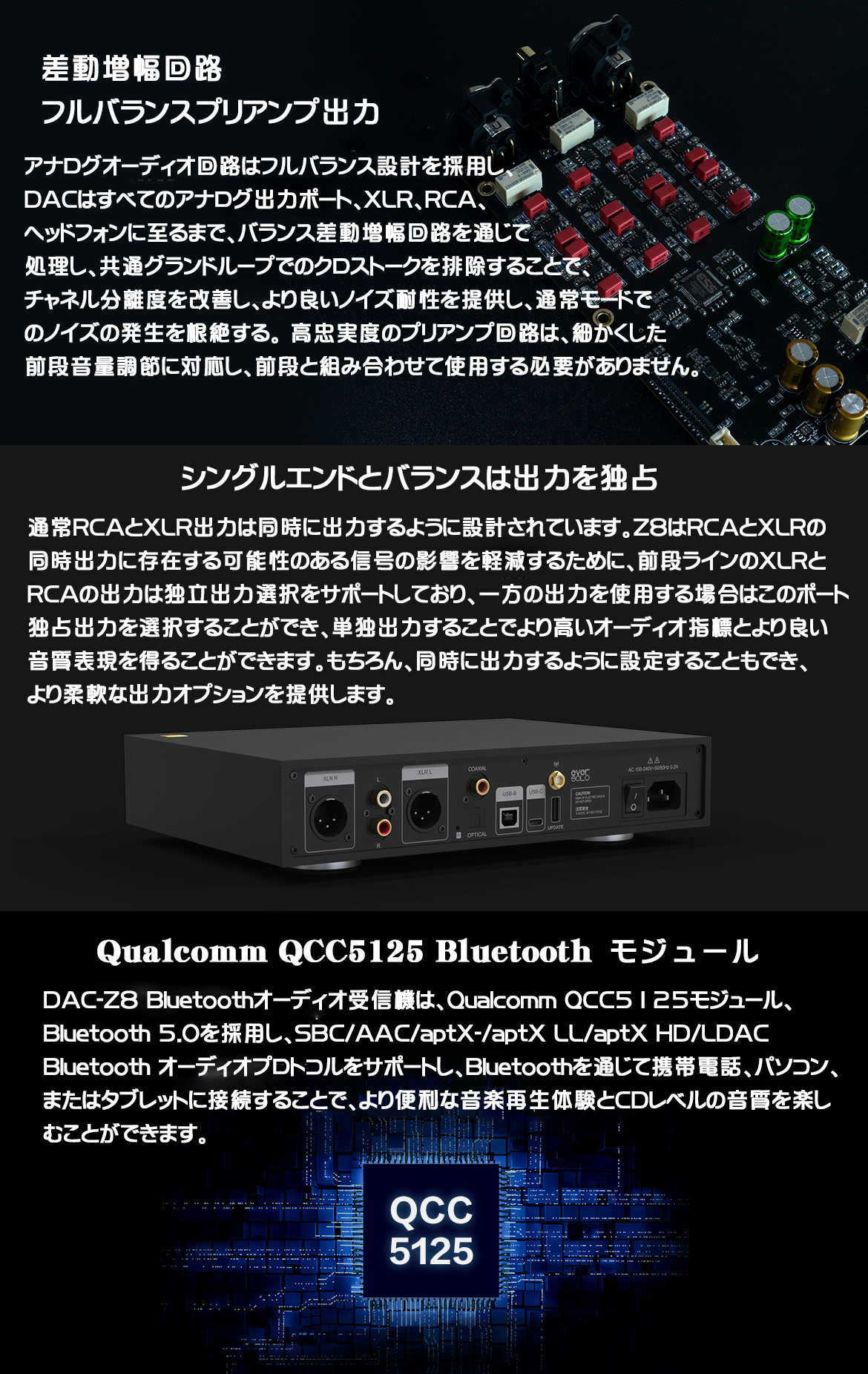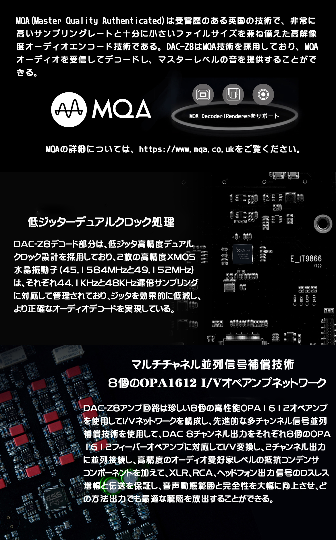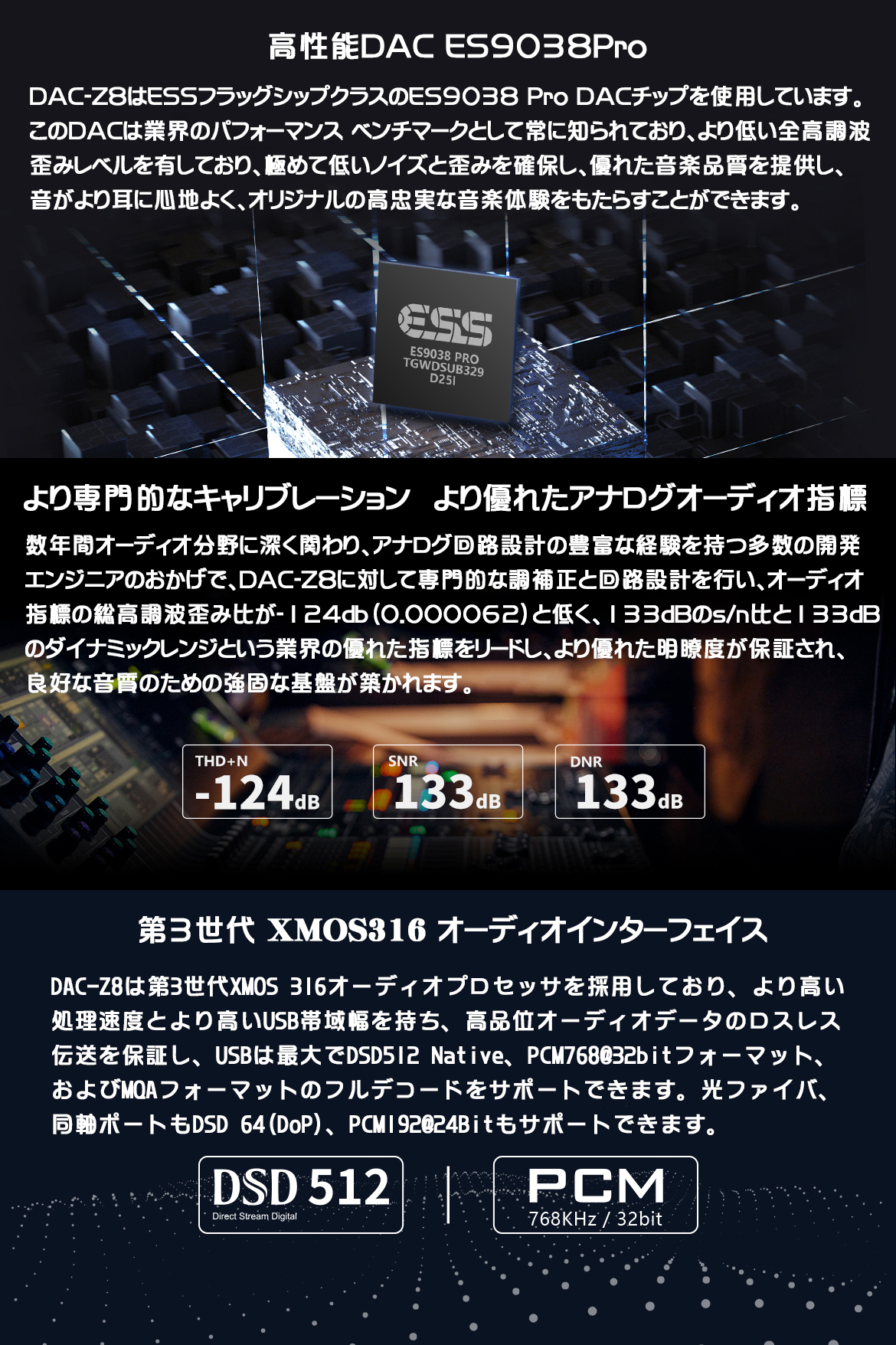 ユーザーマニュアル*1特点 ★DAC-Z8は、洗練された外観を備えた高性能オーディオデコーダです。第3世代XMOS 316オーディオプロセッサーとESSのフラッグシップES9038 Pro DACチップを搭載し、DSD512、PCM 768Khz@32Bit、およびMQAフルフォーマットデコードをサポートする。優れたデコード音質、優れたフロントレベルのパフォーマンス、強力なヘッドフォン駆動力、豊富な入力機能、さまざまなハイエンドヘッドフォンやステレオオーディオ機器に対応し、オリジナルの音楽体験と楽しさをお届けする