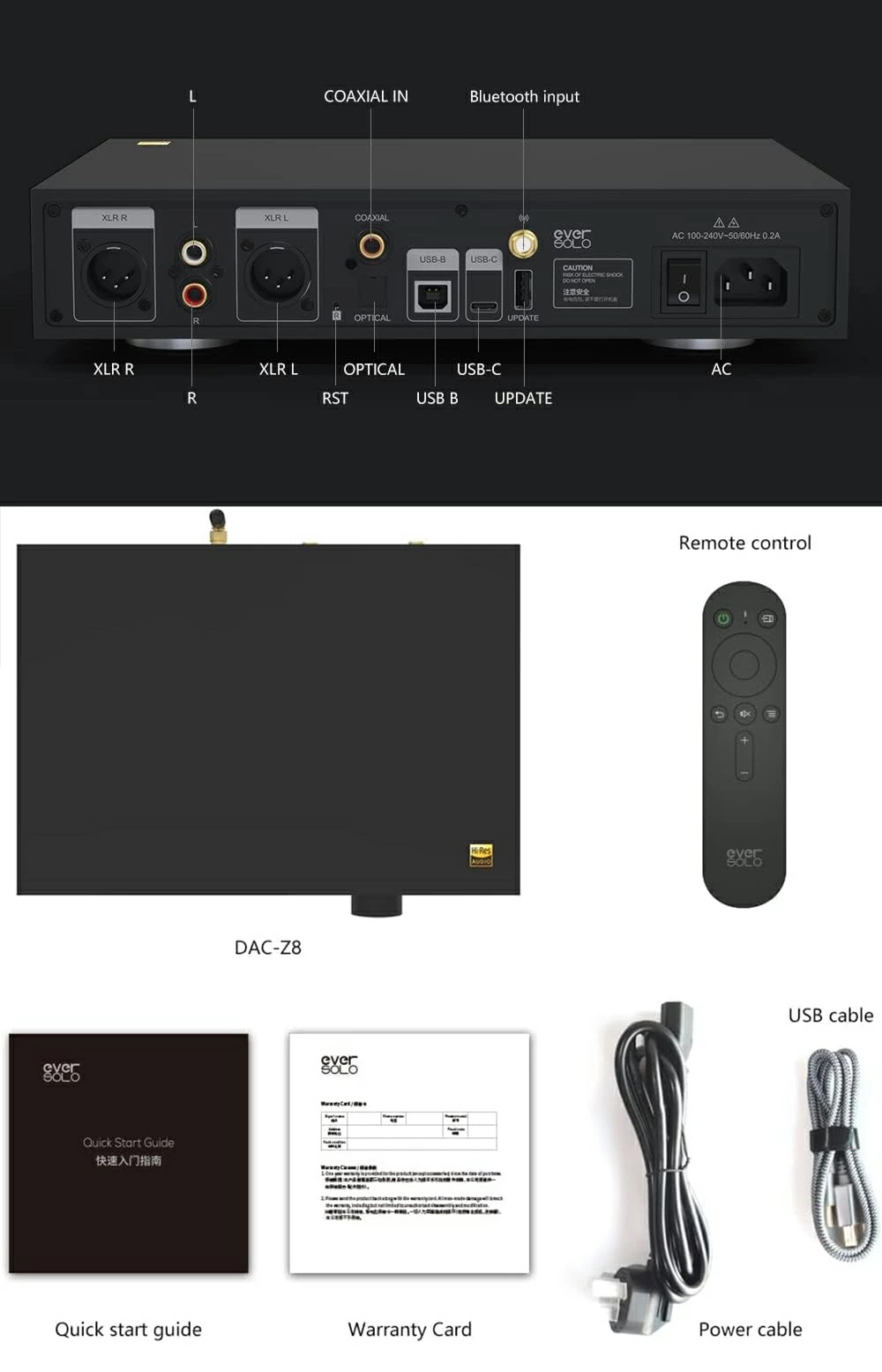 商品型番 EverSolo DAC-Z8ディスプレイ 3inch LCDディスプレイ本体材質 アルミニウム合金オーディオDAC ES 9038Proオーディオプロセッサ 第3世代XMOS XU316オペアンプチップ OPA1612*10電源 低ノイズ・高品質スイッチング電源Bluetoothオーディオ入力 クアルコム QCC5125 Bluetooth モジュール,SBC/AAC/aptX/aptX LL/aptX HD/LDACをサポートUSB-B DAC 入力 USB Audioオーディオ互換性:Windows(7,10)Mac,Android、IOS