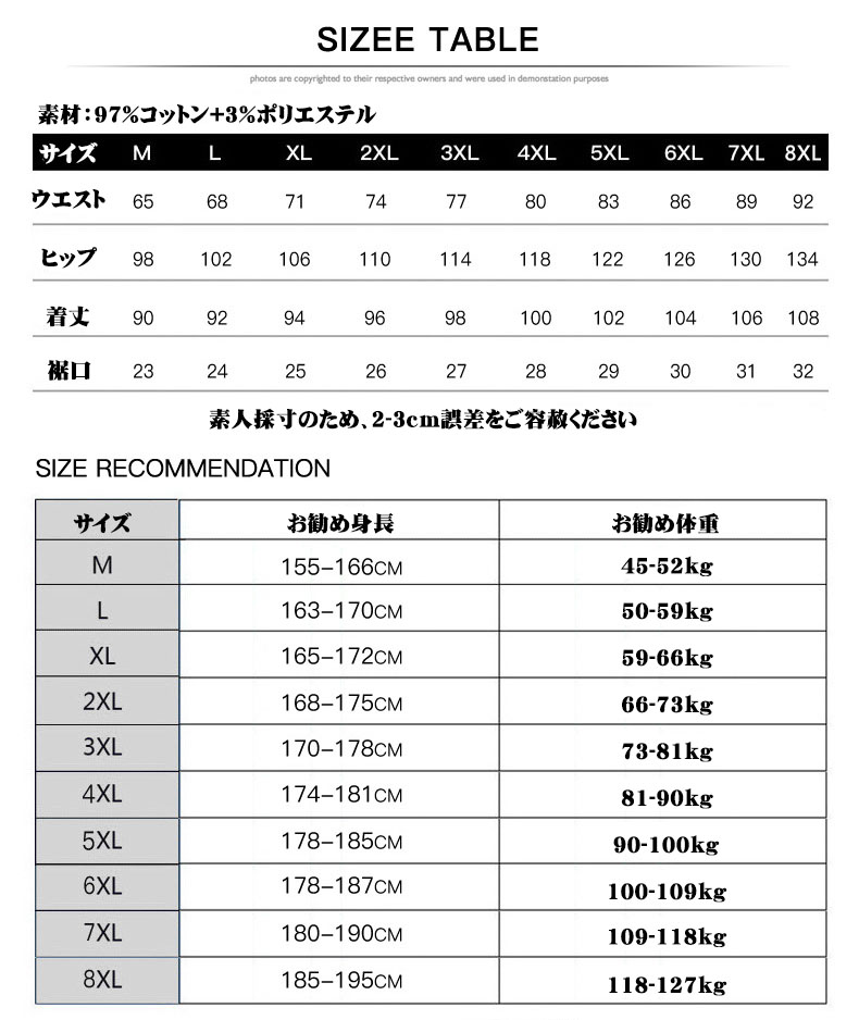サイズ: M L XL 2XL 3XL 4XL 5XL 6XL 7XL 8XL