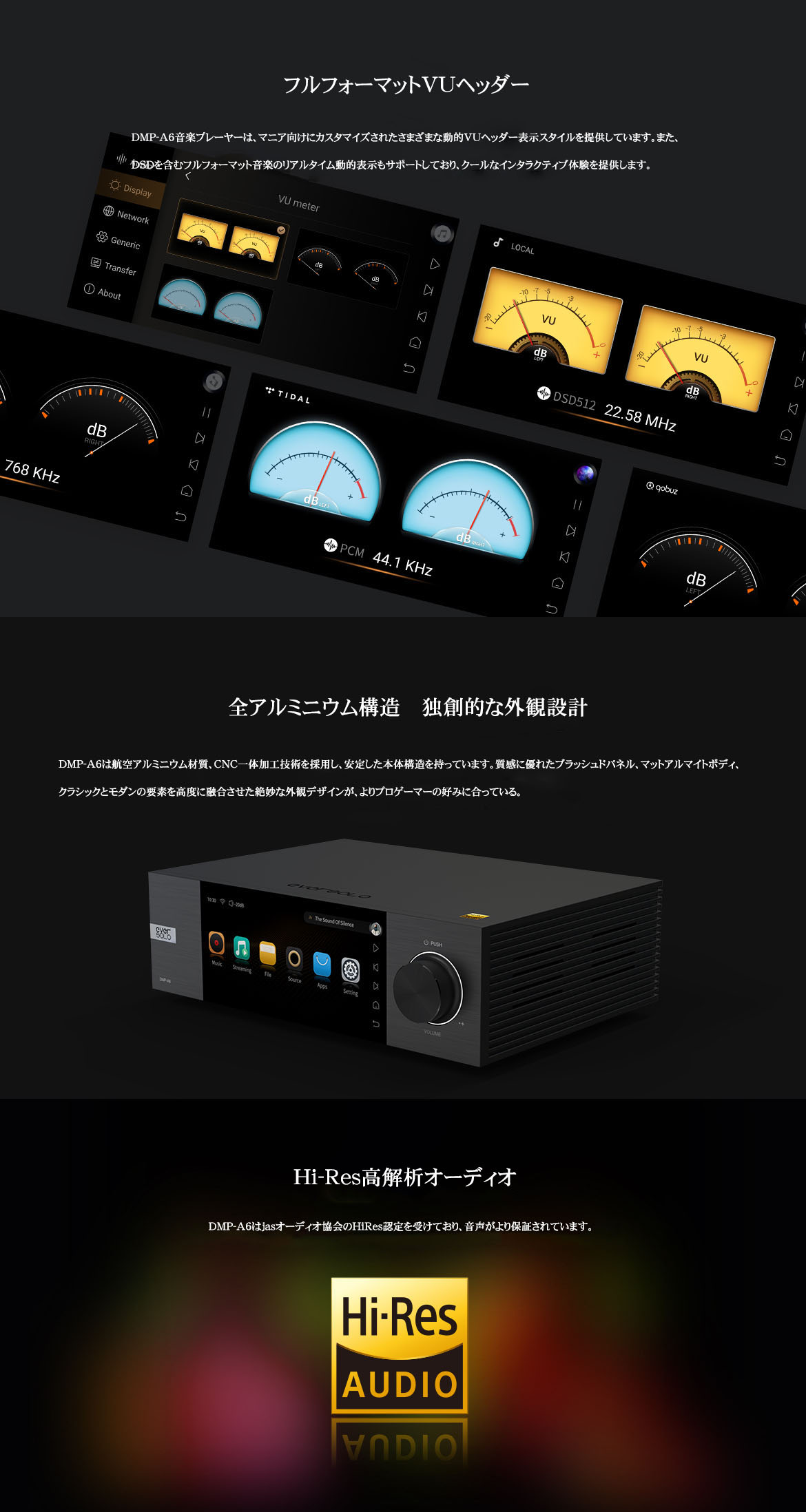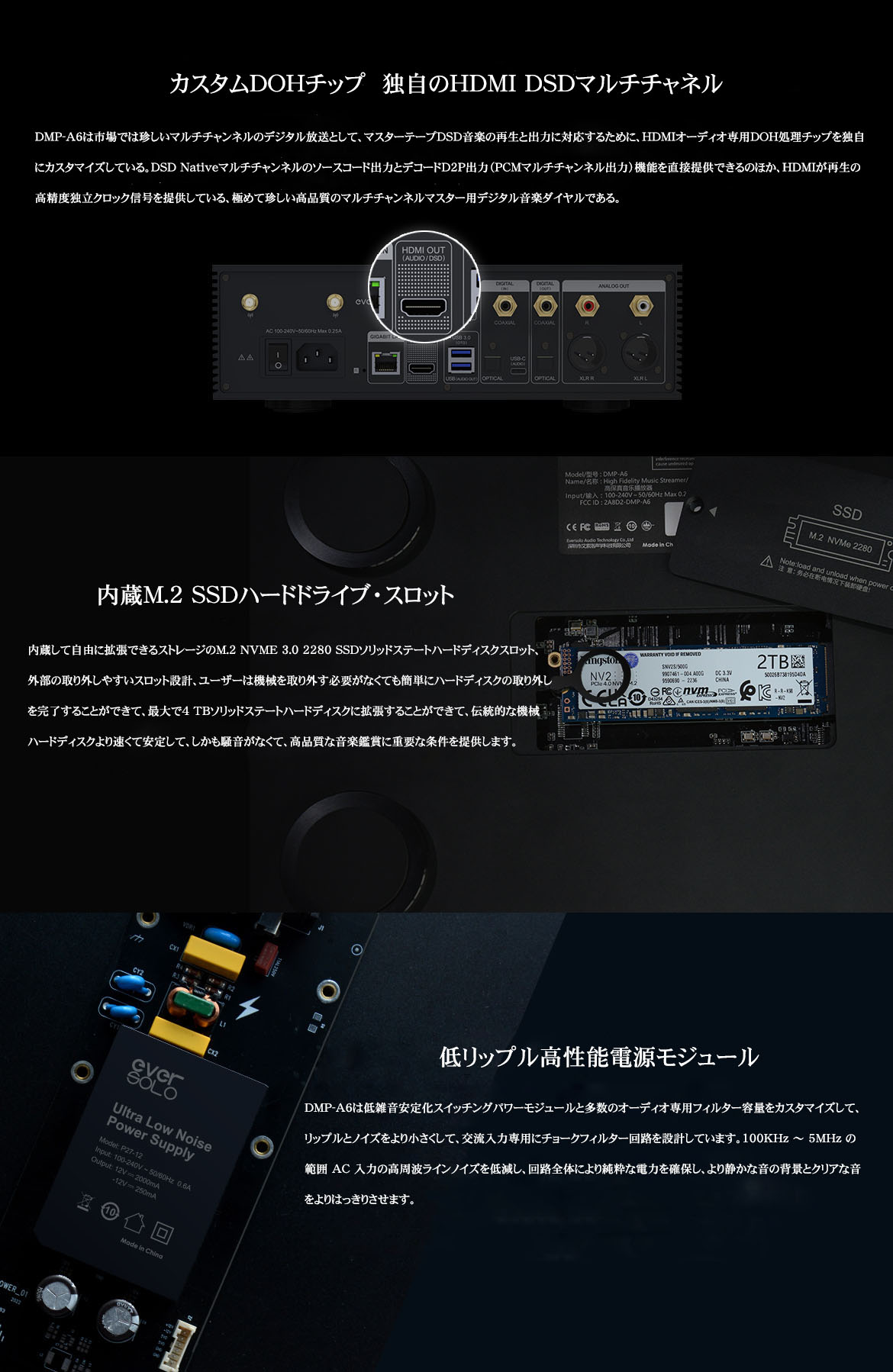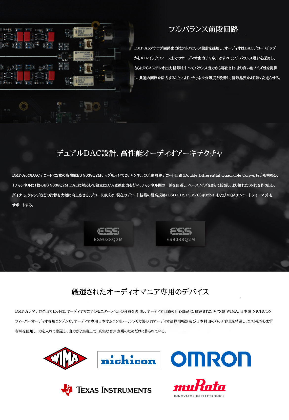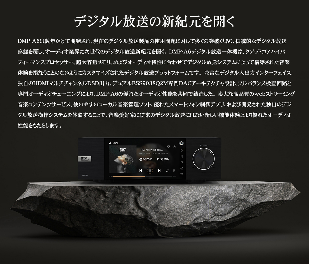 ★DMP-A6は研究開発に数年を費やし、現在のデジタル放送製品の使用上の問題点に対して多くのブレークスルーがあり、伝統的なデジタル放送の形態を覆し、オーディオ業界に次世代デジタル放送の新紀元を切り開いた。DMP-A6マルチキャストオールインワンは、クアッドコアのハイパフォーマンスなプロセッサー、大容量メモリ、およびオーディオ特性に合わせて高度にカスタマイズされたマルチキャストシステムで構成された、ロスレスな音楽体験を実現するためのマルチキャストプラットフォームです