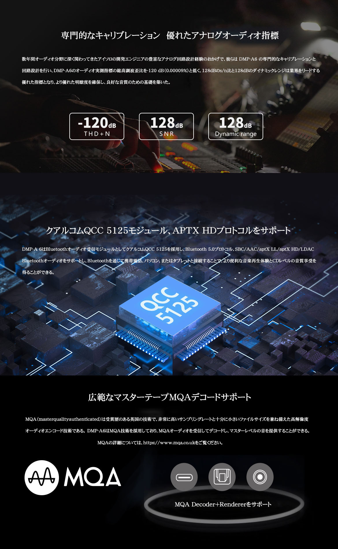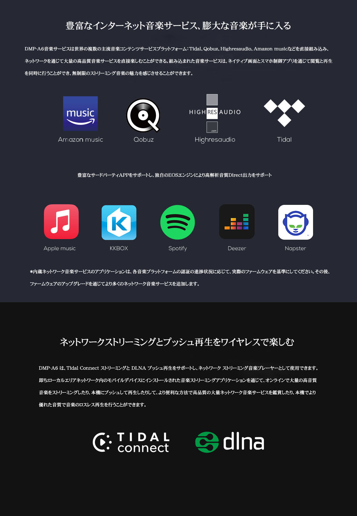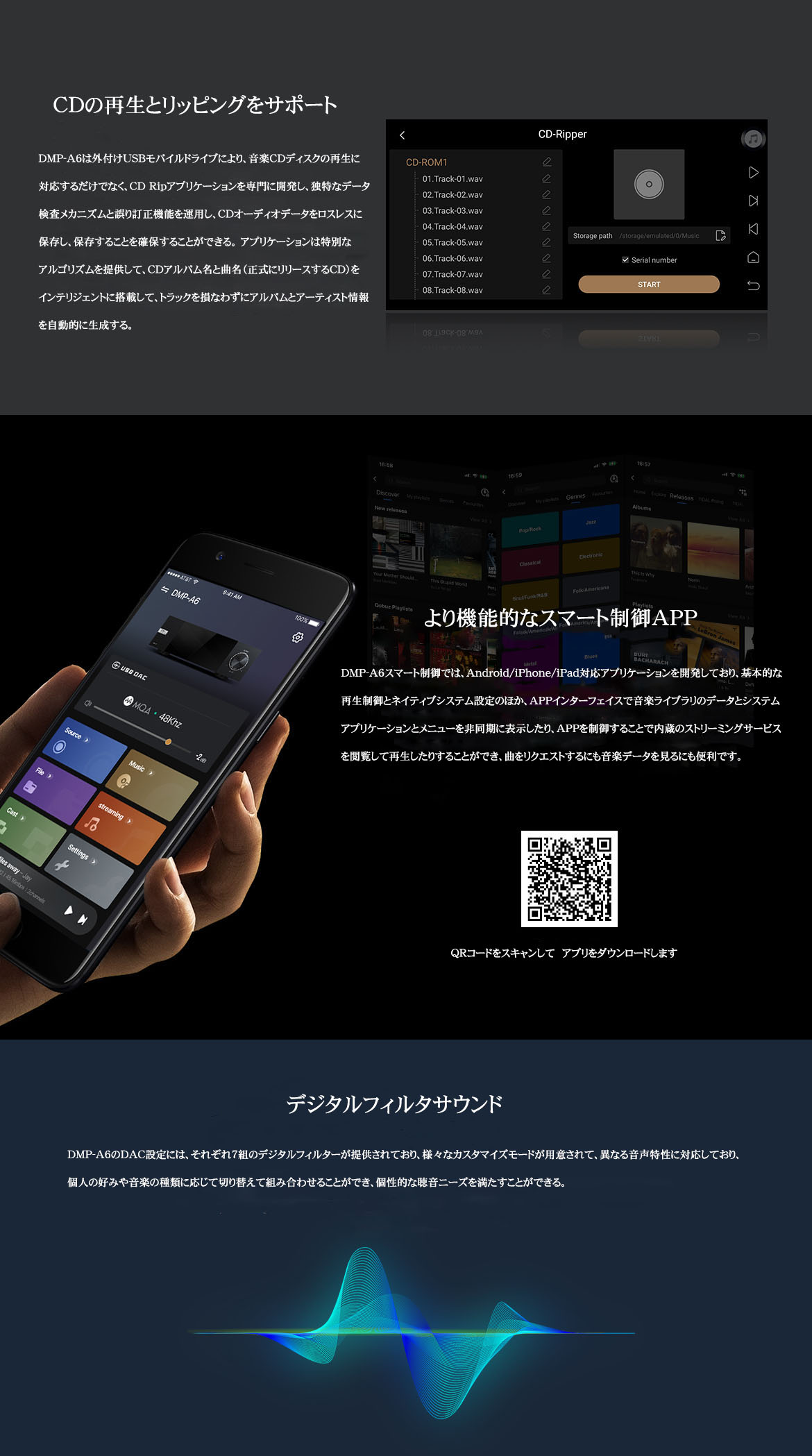 ★DMP-A6は研究開発に数年を費やし、現在のデジタル放送製品の使用上の問題点に対して多くのブレークスルーがあり、伝統的なデジタル放送の形態を覆し、オーディオ業界に次世代デジタル放送の新紀元を切り開いた。DMP-A6マルチキャストオールインワンは、クアッドコアのハイパフォーマンスなプロセッサー、大容量メモリ、およびオーディオ特性に合わせて高度にカスタマイズされたマルチキャストシステムで構成された、ロスレスな音楽体験を実現するためのマルチキャストプラットフォームです