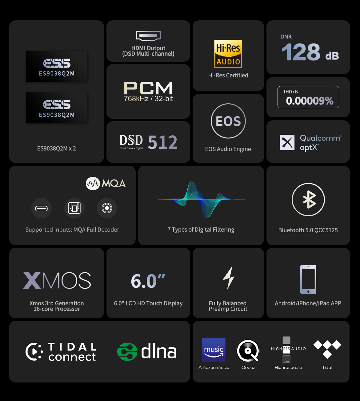 最高ステレオ DSD512 、PCM 768KHz 32Bit 、MQAまでの再生をサポート光ファイバ―/同軸オーディオ入力 最高ステレオ PCM 192KHz 24Bit 、DSD64 Dop、MQAまでの再生をサポートHDMI オーディオ出力 DSD64 Nativeマルチチャネル/PCM192KHzマルチチャンネルソース出力USB オーディオ出力 最高ステレオ DSD512 Native、PCM 768KHz 32Bit 、MQAまでの再生をサポートアナログオーディオ出力 プリアンプ出力:XLR(バランス)+RCA制御方法 モバイルアプリ、タッチスクリーン制御XLR出力オーディオ特性 出力レベル: 5.2V