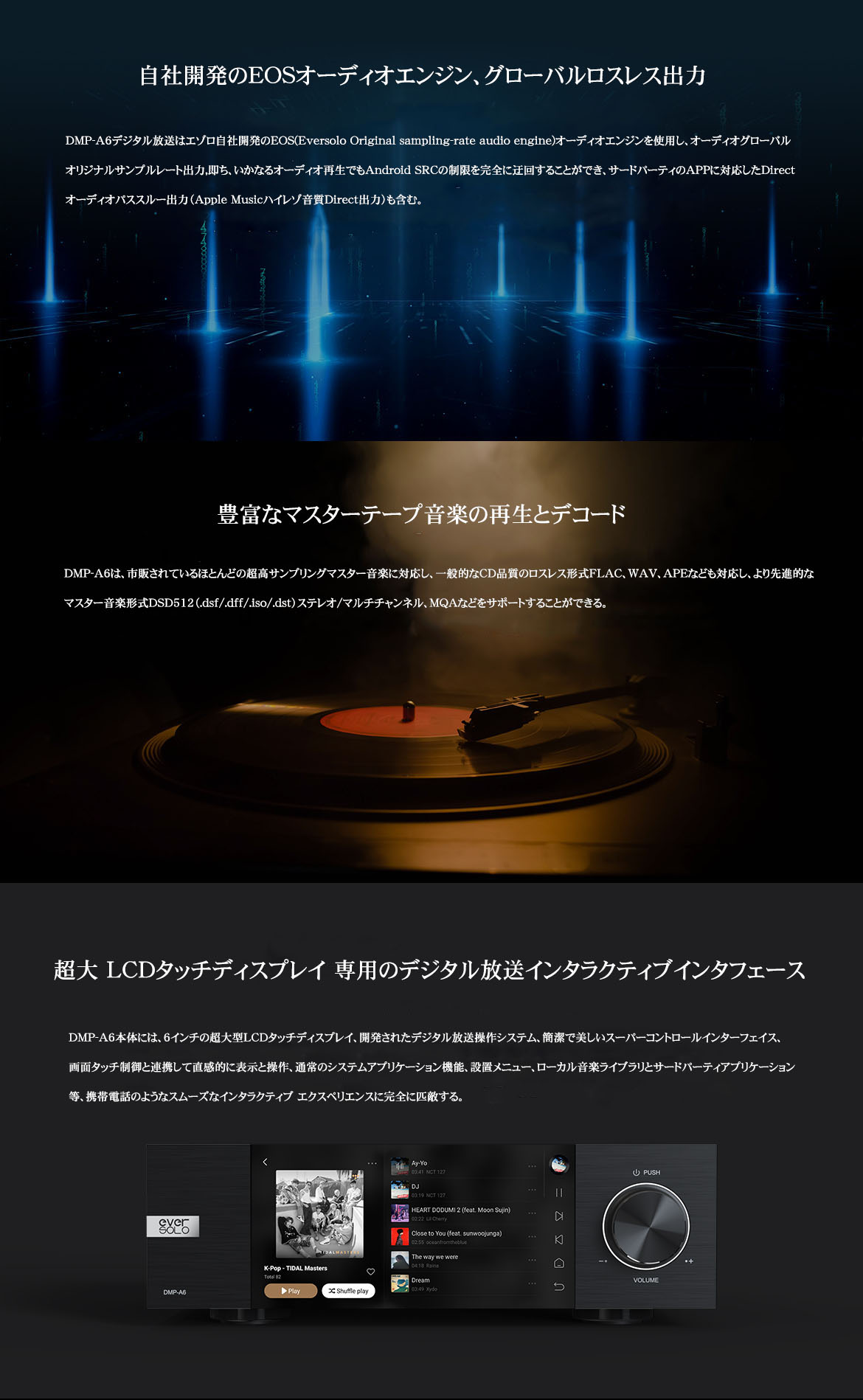 ユーザーマニュアル*1特点 ★DMP-A6 Digital Castingは、AudoGlobalオリジナルサンプリングレート出力をサポートするEOS(Eversolo Original sampling-rate audio engine)オーディオエンジンを使用しています。つまり、サードパーティ製アプリのDirectオーディオパススルー出力(Apple Music高解析音質Direct出力)のサポートなど、どのようなオーディオ再生でもAndroid SRC制限を完全に回避できる。