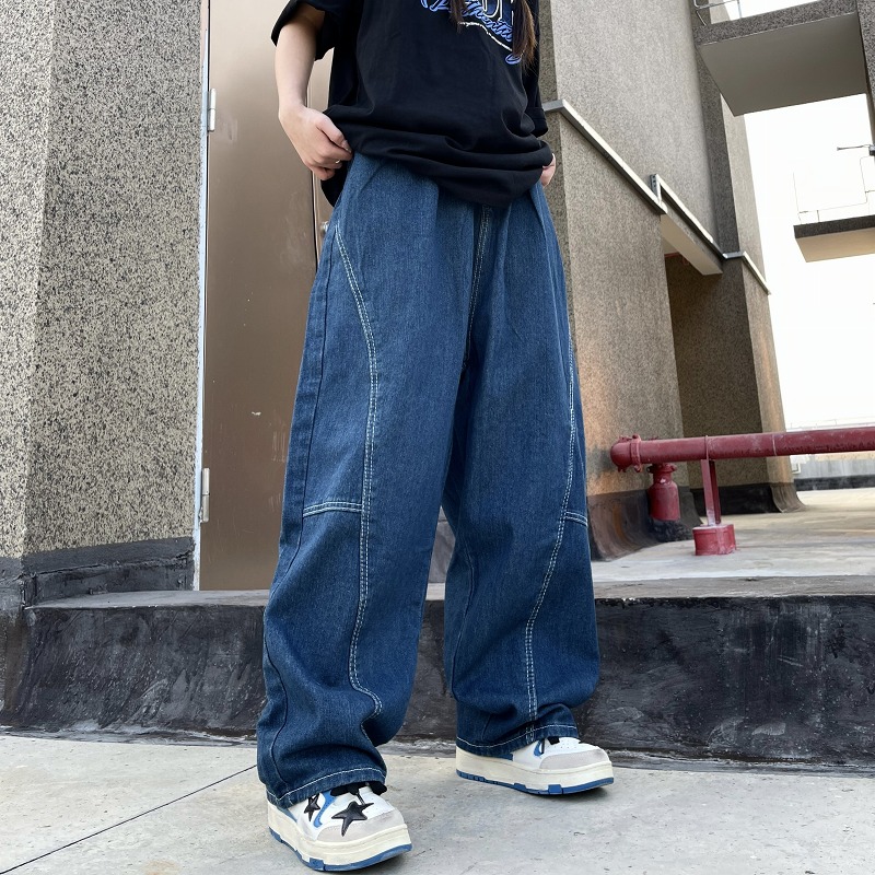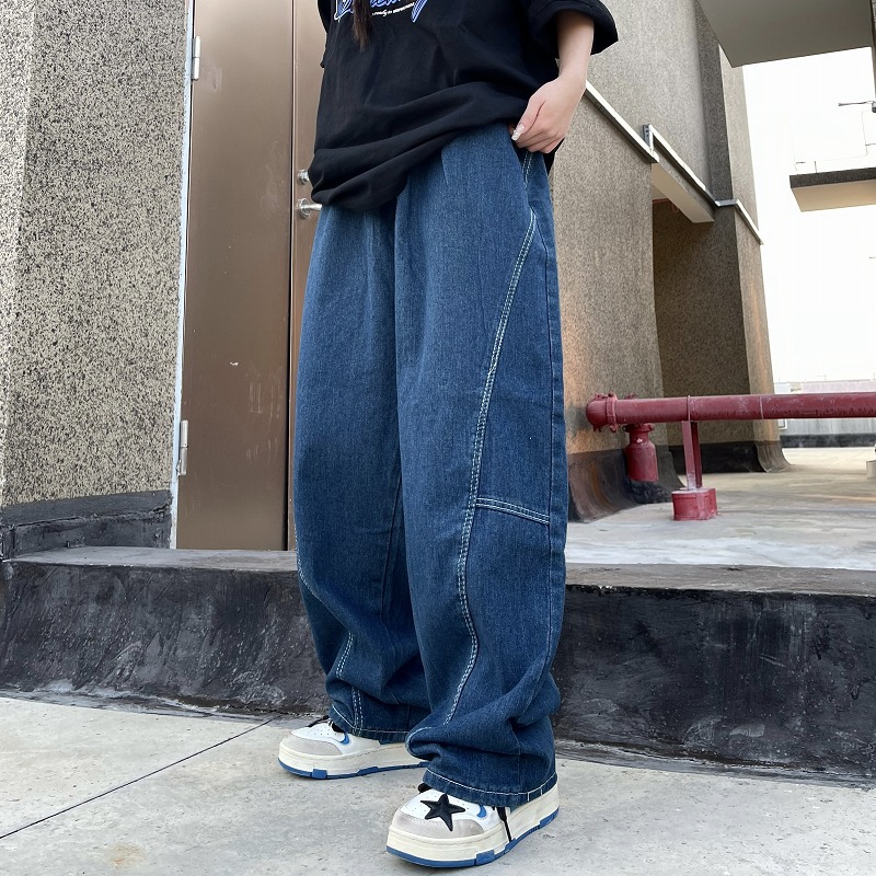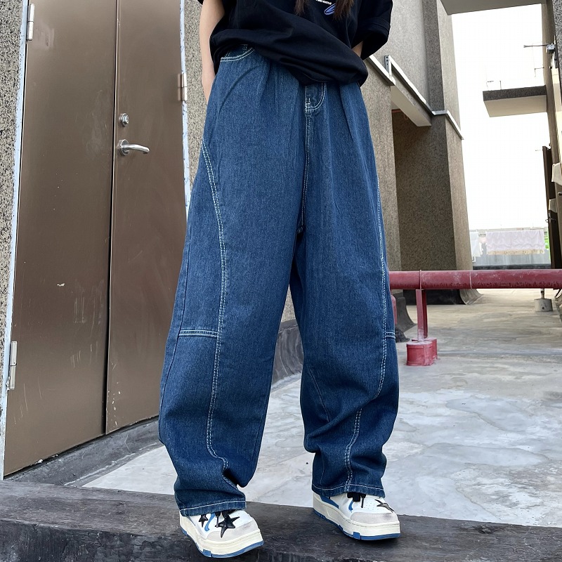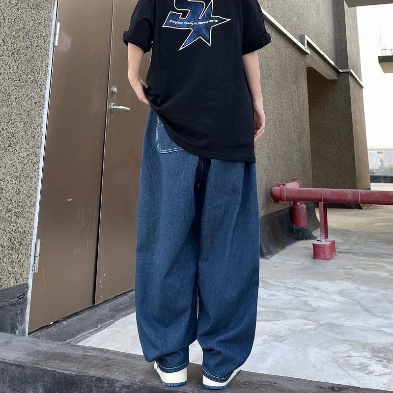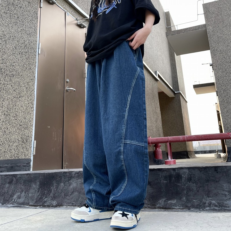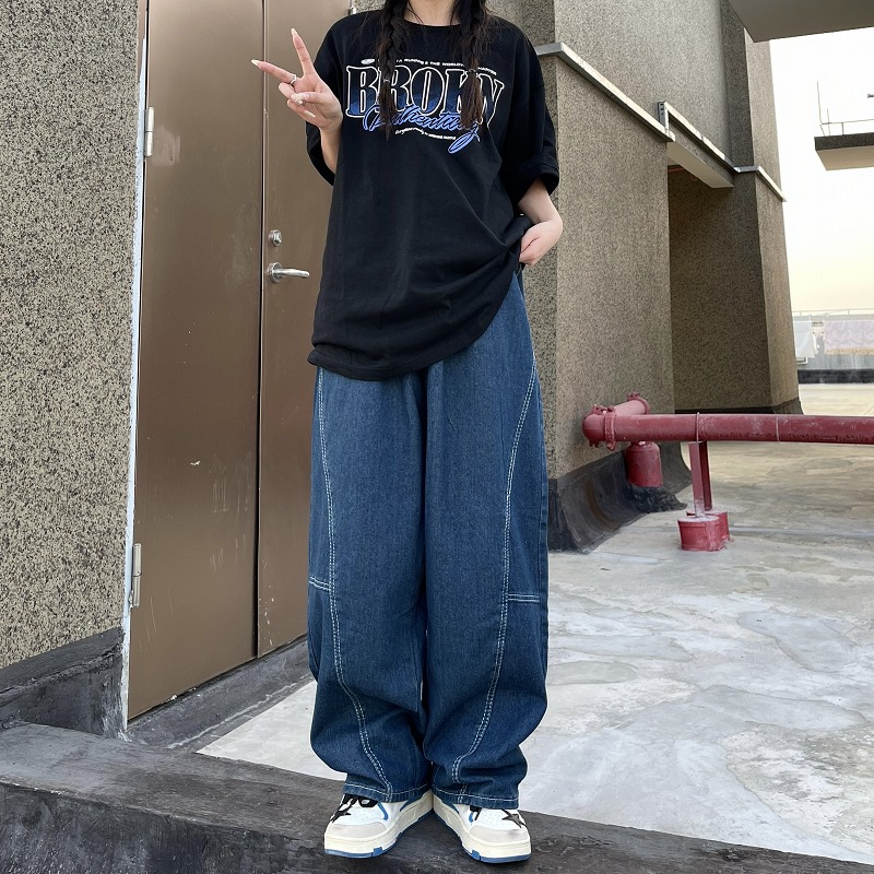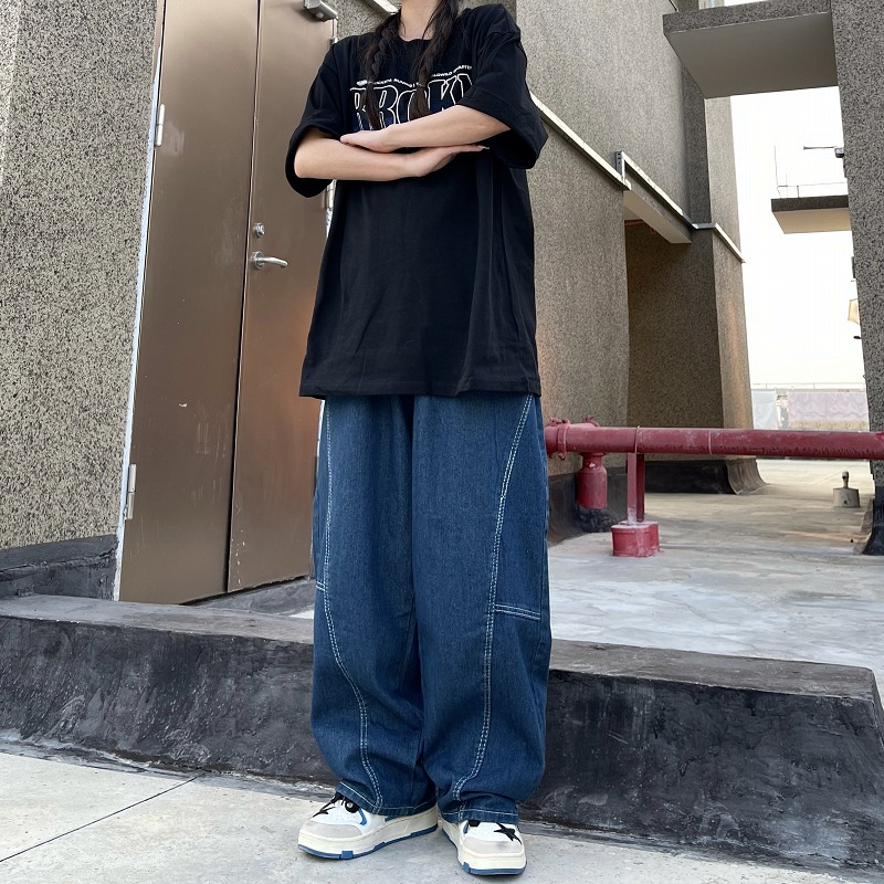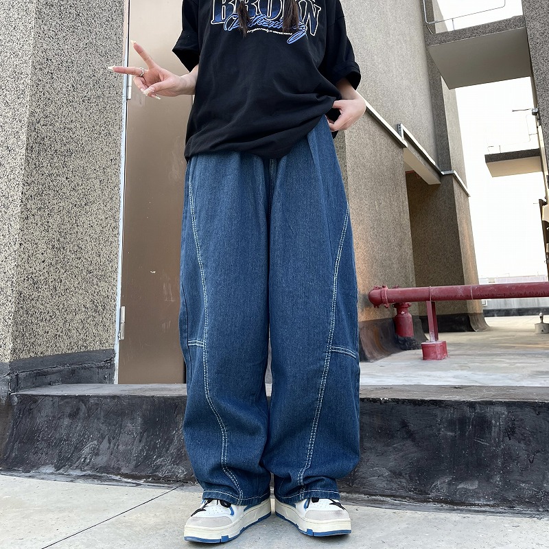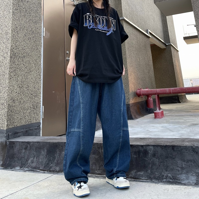 パンツ ズボン 切り替え 体型カバー デニム ヴィンテージ風 レトロ調 原宿系ファッション 韓国風 ダンス 衣装 ダンサー ヒップホップ HIPHOP 個性 奇抜 かわいい 青文字系 ボトムス レディ