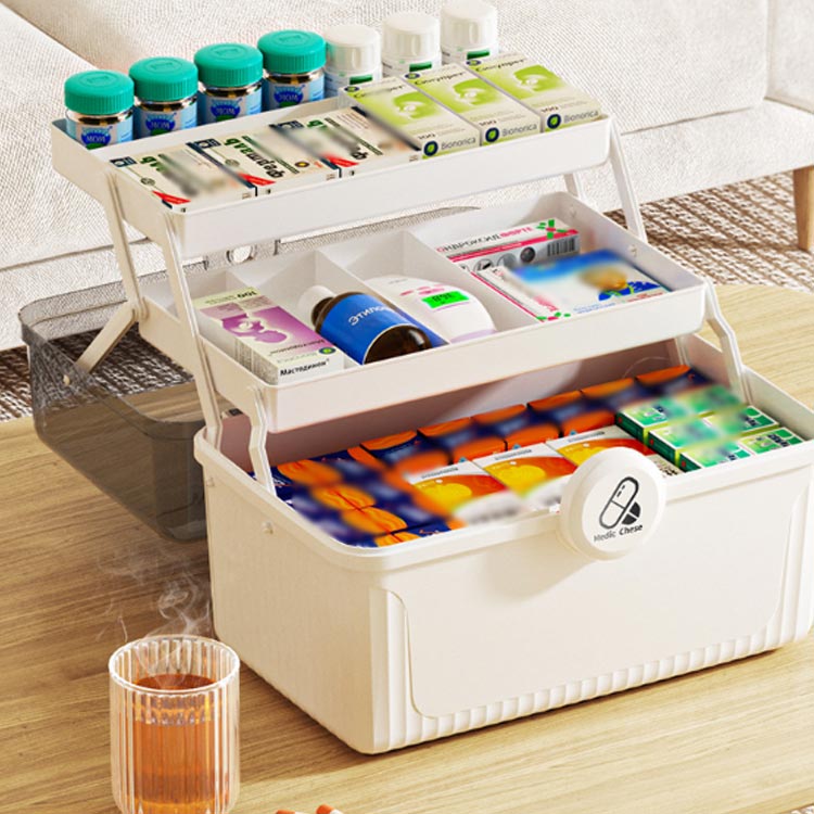 【大容量・おしゃれ】普通の薬収納や救急ボックス、工具箱より大容量でおしゃれな収納ケースです。3段式のため沢山のモノを綺麗に収納することが可能です。 高さも十分にあるため、薬によっては問題なく縦に置くことができ、旧製品を使用する際に薬や液体などを横にしか置かないという問題を解決します。
