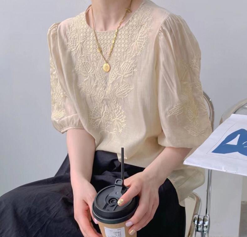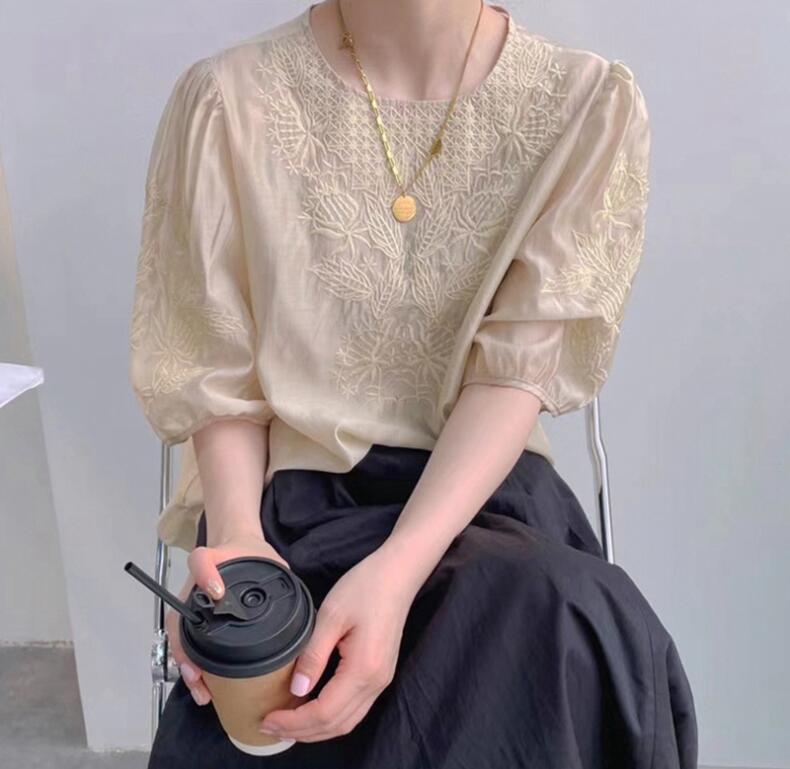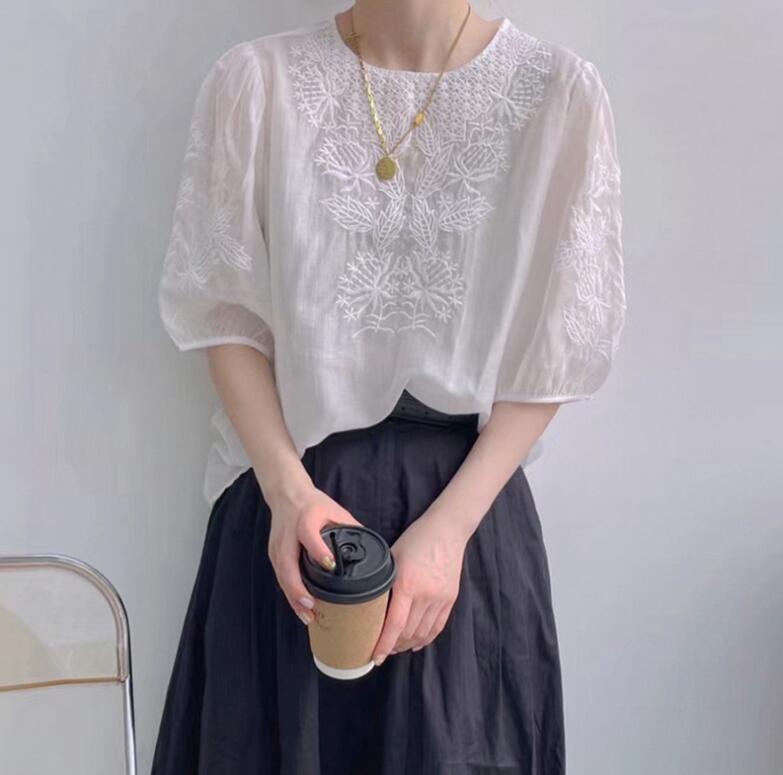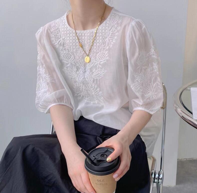 ブラウス レディース 春夏 トップス シャツ 5分袖 白シャツスキッパー レース 刺繍 ナチュラルカジュアル 森ガール きれいめ
