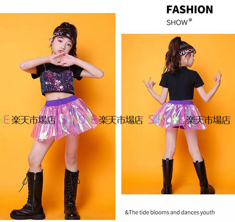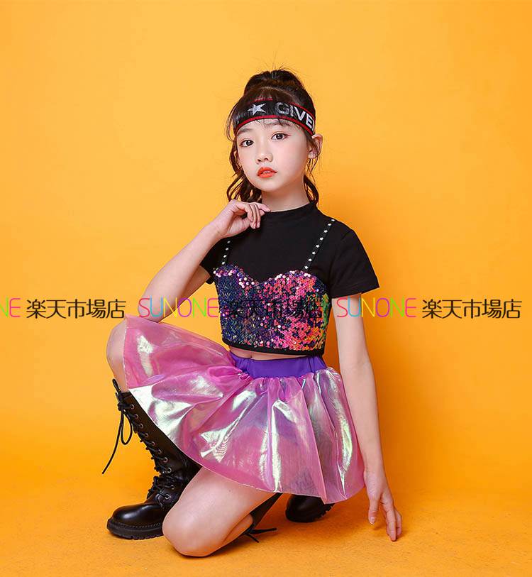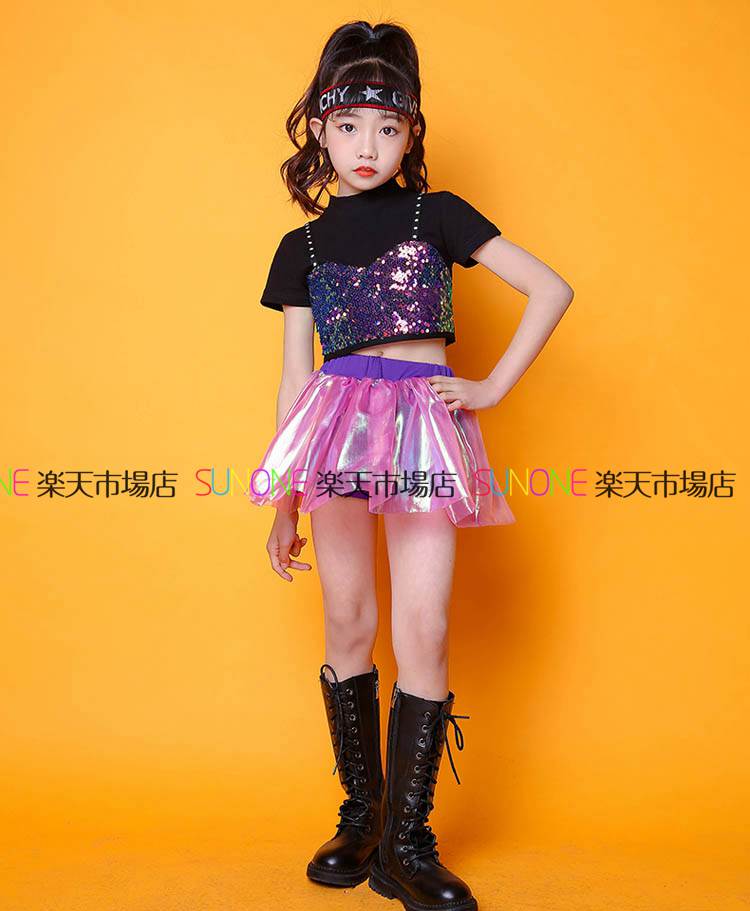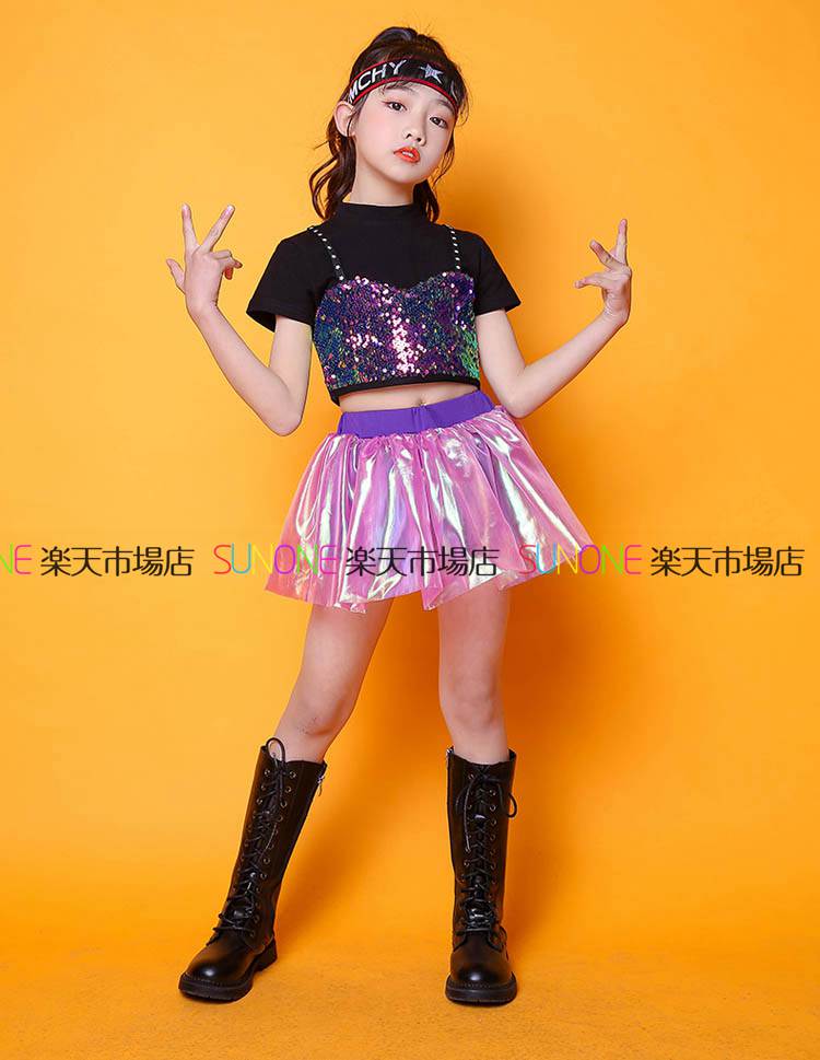 キッズ ダンス 衣装 スパンコール チアガール セットアップ へそ出し 韓国 キッズ ダンス スカート ヒップホップ 女の子 2点セット ジャズダンス ガールズ チアリーダー 半袖 子供 HIPHOP