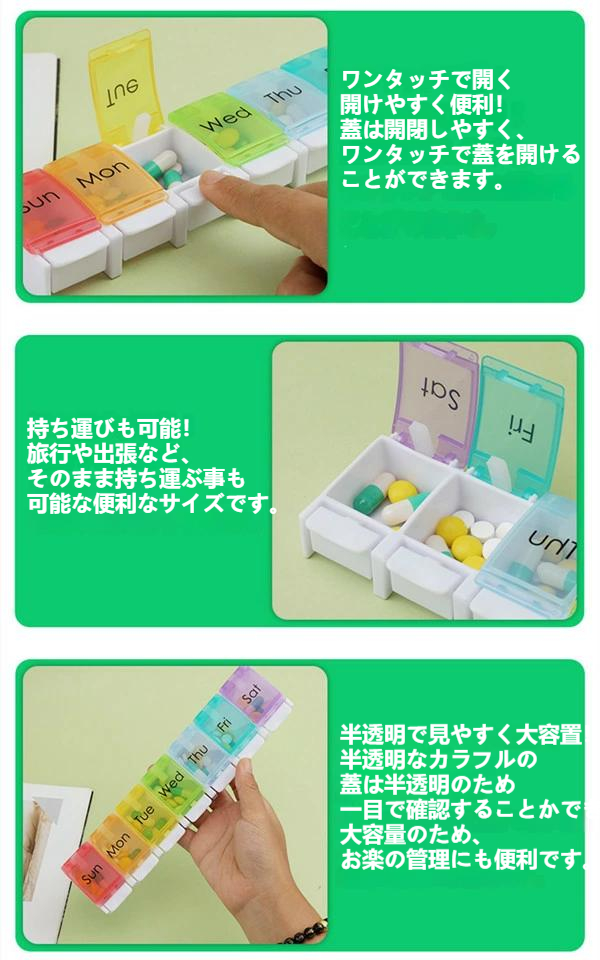 1週間 薬ケース 7日用 サプリメントケース 収納 ピルケース 飲み忘れ防止 携帯用 薬 入れる 1週間分 薬箱 飲み忘れ 大容量