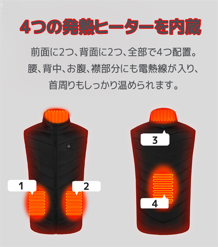 電熱ベスト 防寒ウエア 加熱ベスト ヒーターベスト ヒートベスト 防寒チョッキジャケット 電熱コート 屋外作業 男女兼用 通勤通学 USB給電 4枚内蔵 大きいサイズ 速暖 防寒 洗える