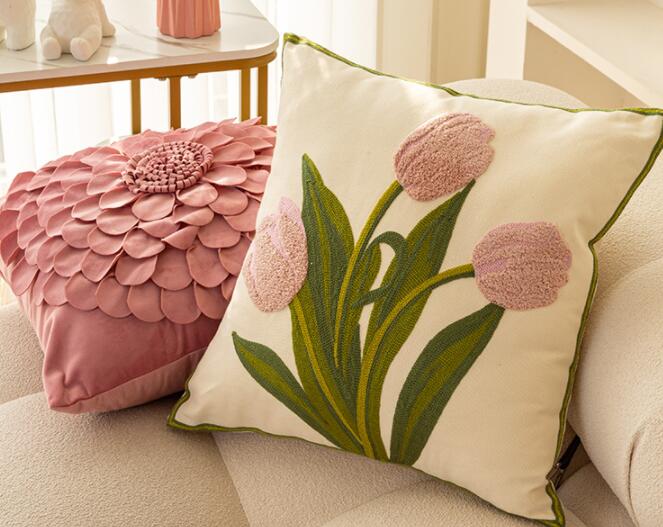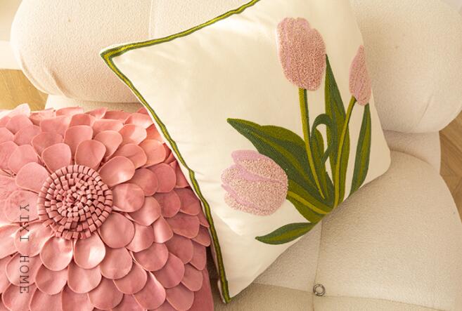 チューリップクッションクッションカバーカバーピンクグリーンフラワーもこもこ大きい大きめ45cm×45cm北欧おしゃれ可愛いデザイン洗える四角正方形韓国雑貨インテリア北欧ふわふわ刺繍