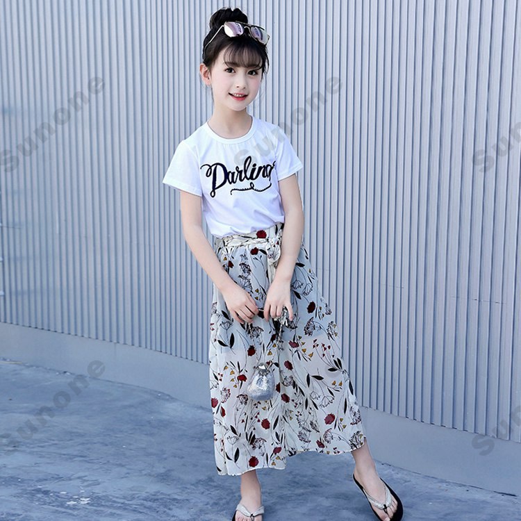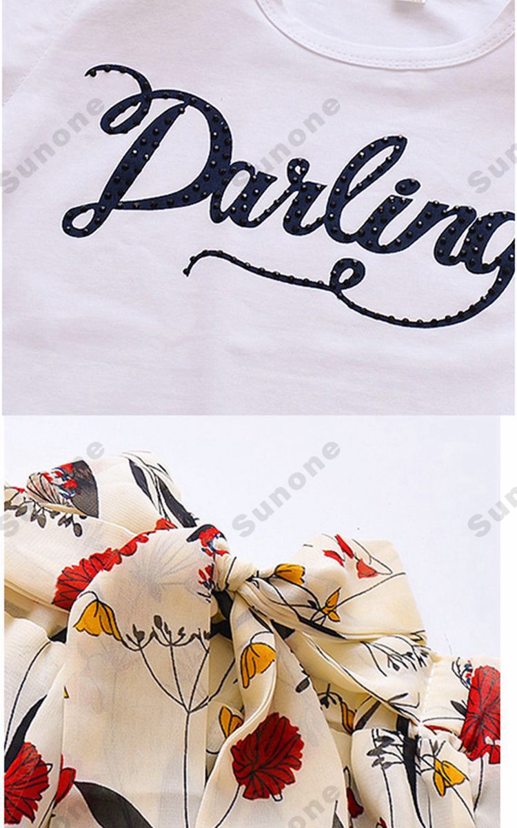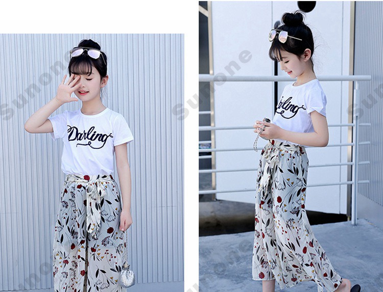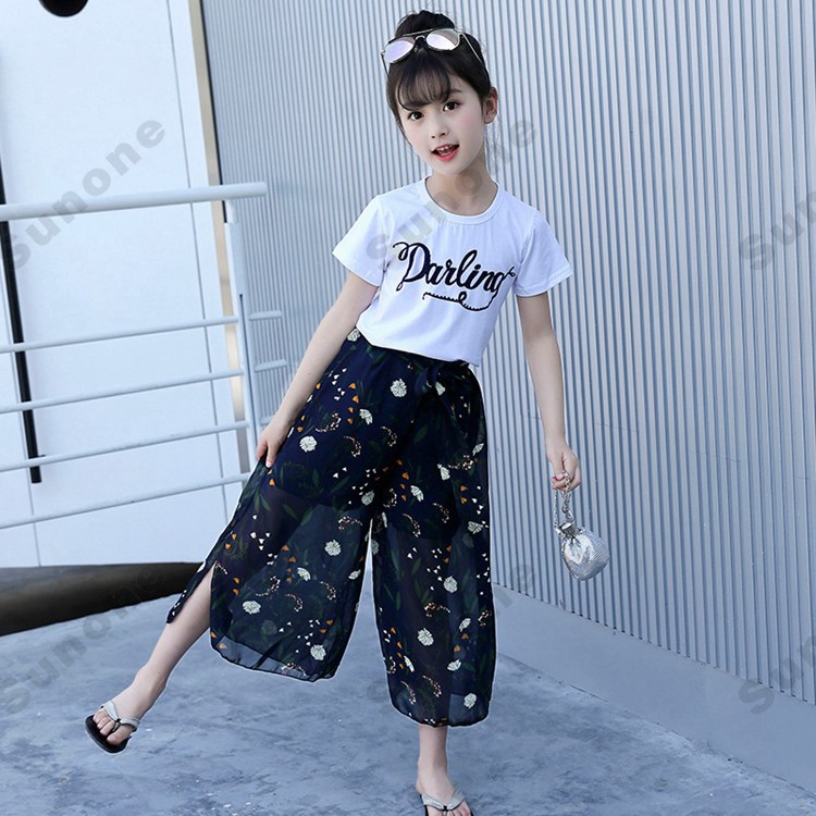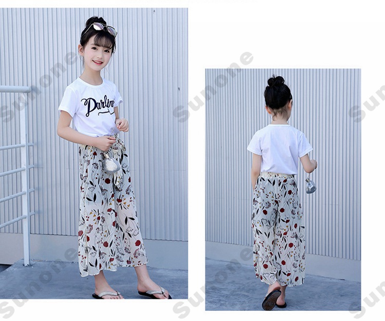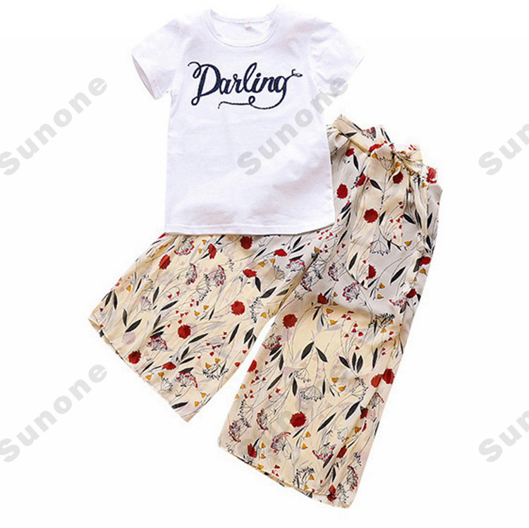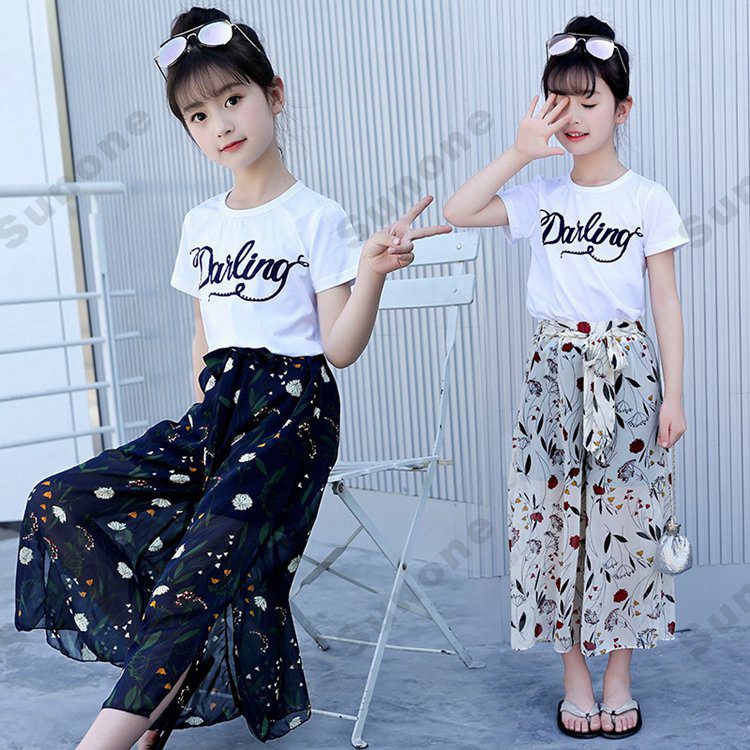 セットアップ キッズ 女の子 韓国子供服 上下セットカジュアル ナチュラル 半袖 花柄 トップス+ズボン ワイドパンツ シフォンズボン ガウチョパンツ 七分丈パンツ 可愛