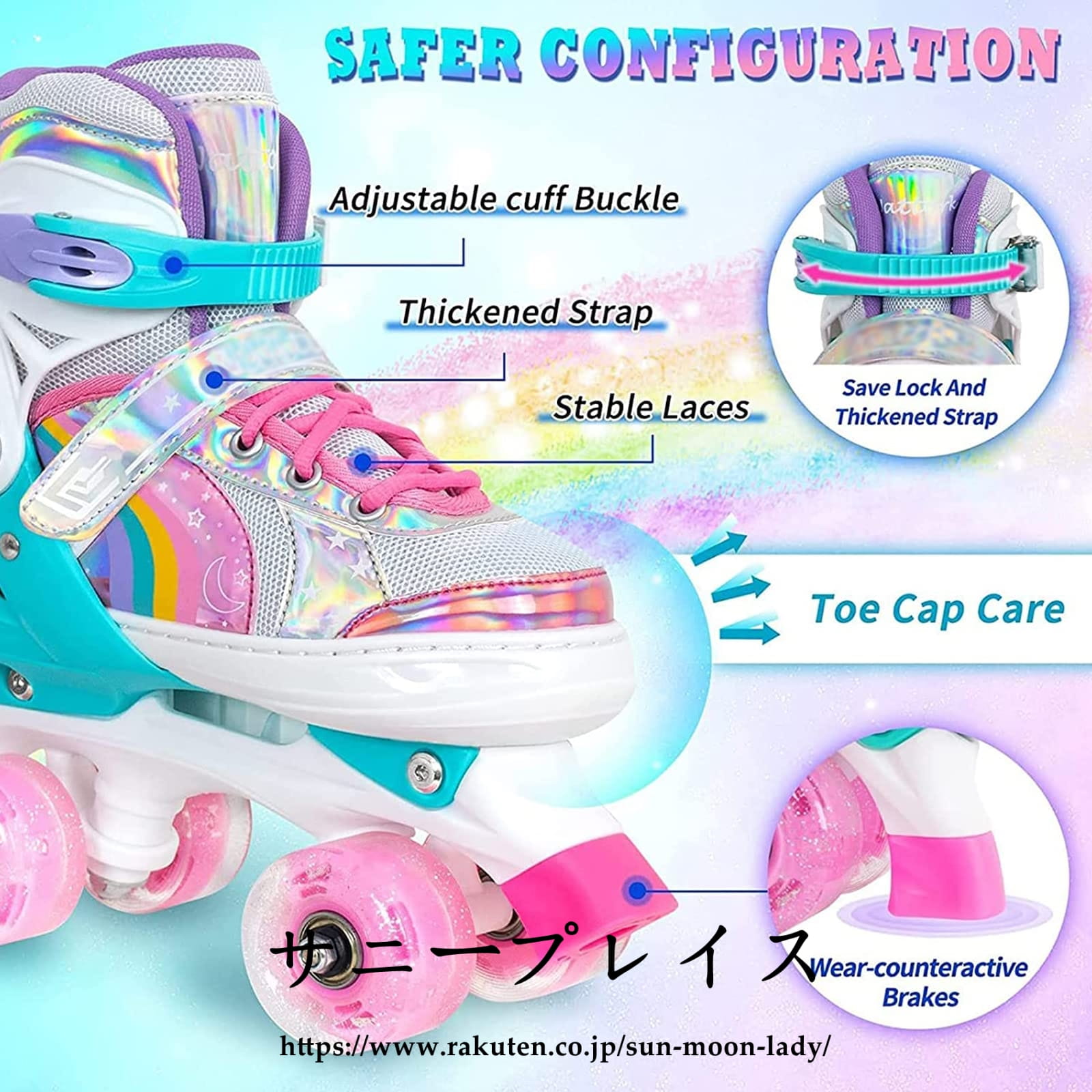 【初心者向け設計】子供用のローラースケートには、スケートを始めると自動的に点灯する8つの照明ホイールが付いています。ローラースケートは、お子様の成長に合わせて4つの調整可能なサイズで利用できます。サイズを調整するための簡単で便利な1つのボタンで、正確なフィット感を見つけます ! 3サイズ(XS/S/M)からお選びいただけますので、ご注文前にサイズをご確認ください。