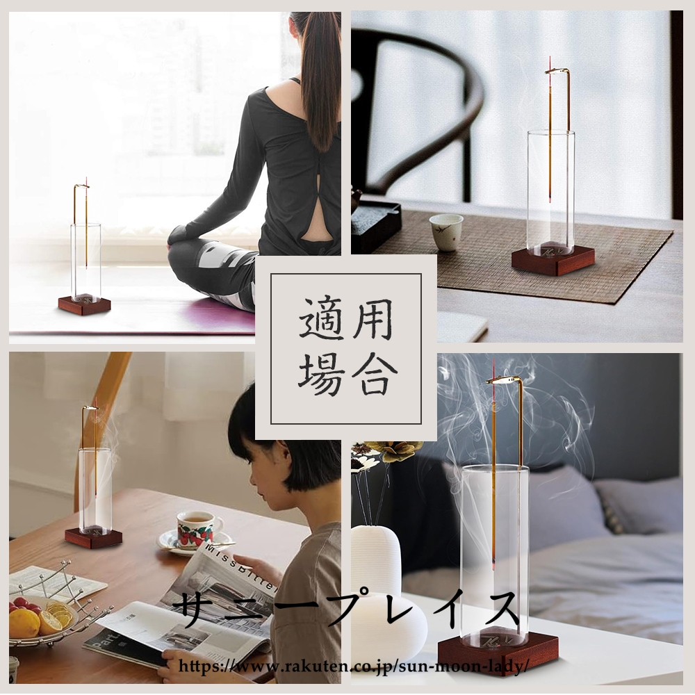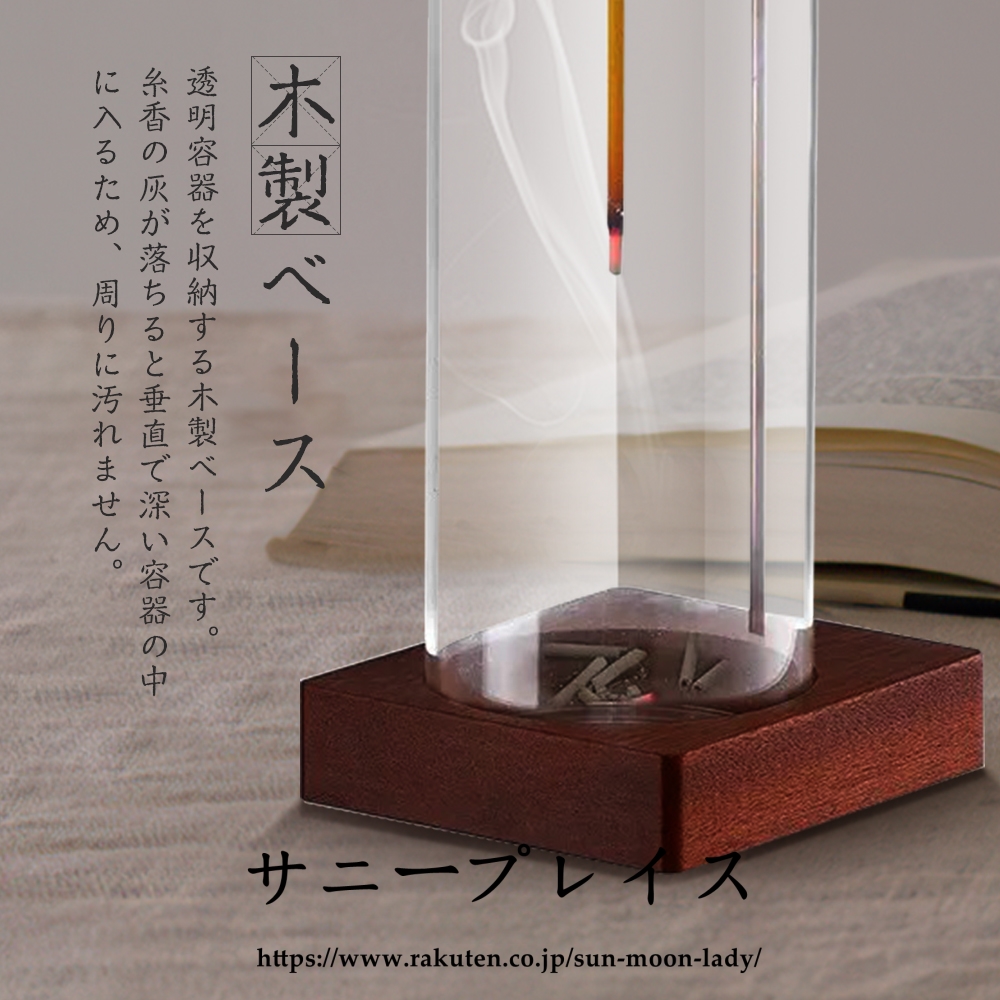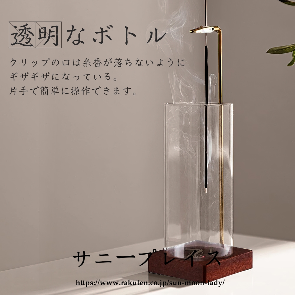 ベースはクルミの木を採用、容器はガラス製透明感があり、どんなインテリアにもマッチするので様々なシーンで活躍します。 リビング、仏壇 、書斎、 玄関先のほかホテル、カフェ、ヨガルーム、イベント会場等ゲストのおもてなしの香りとして活用 線香立てのクリップ部分は長時間の使用可能な黄銅素材なので高温で酸化しにくい変形のしにくいです。